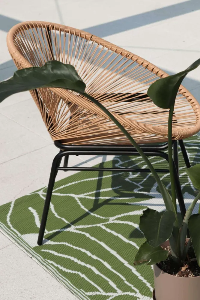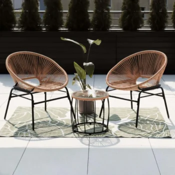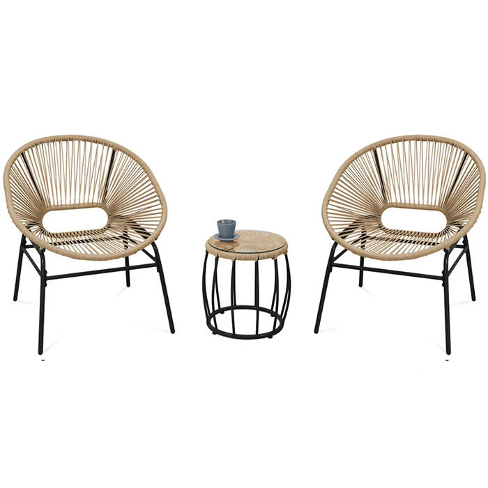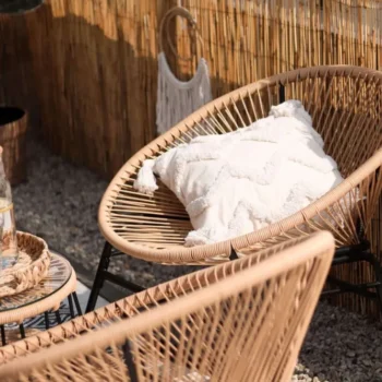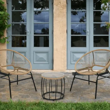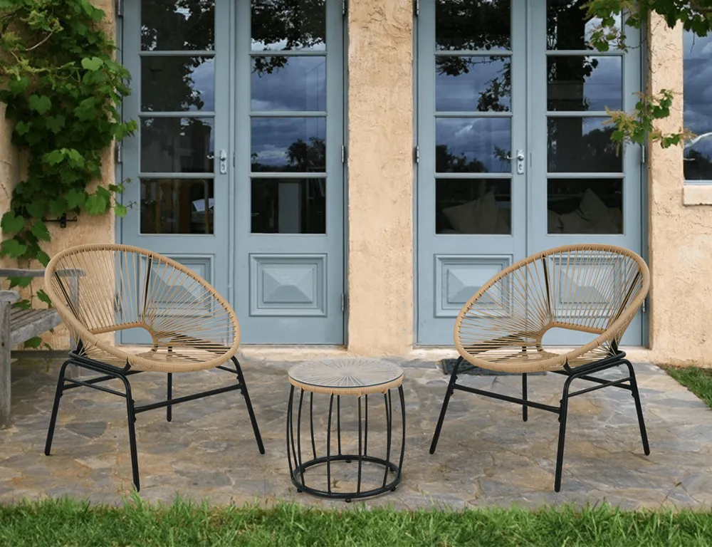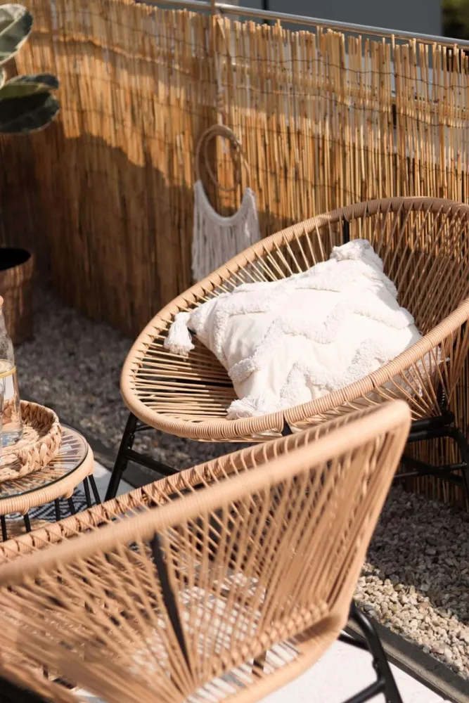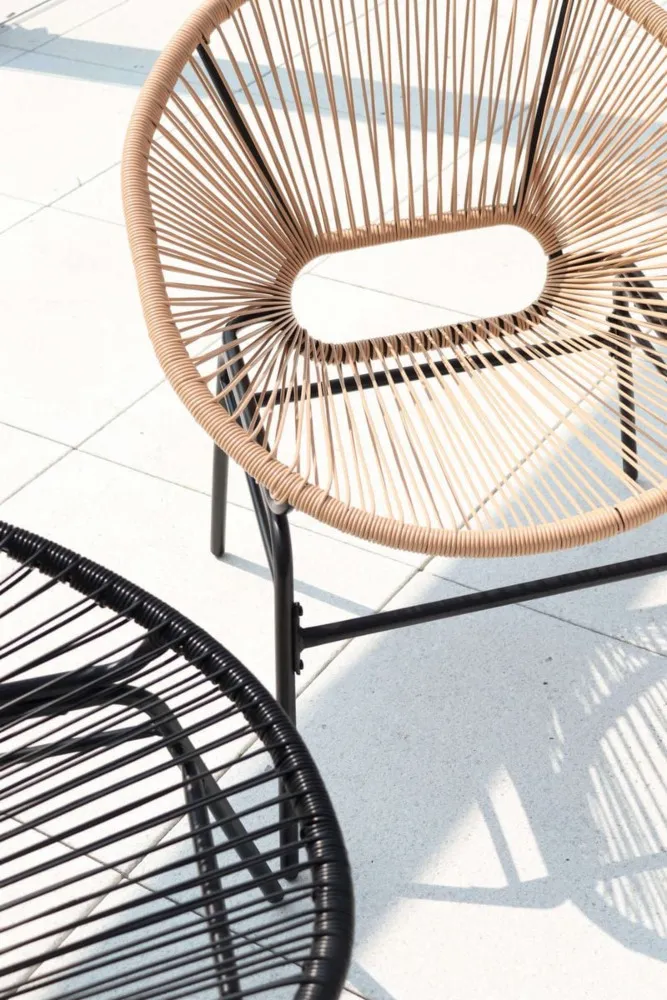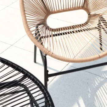 Dva udobna naslanjača in praktična klubska mizica se odlično podajo v različne prostore – od mestnih balkonov do prostornih teras. -