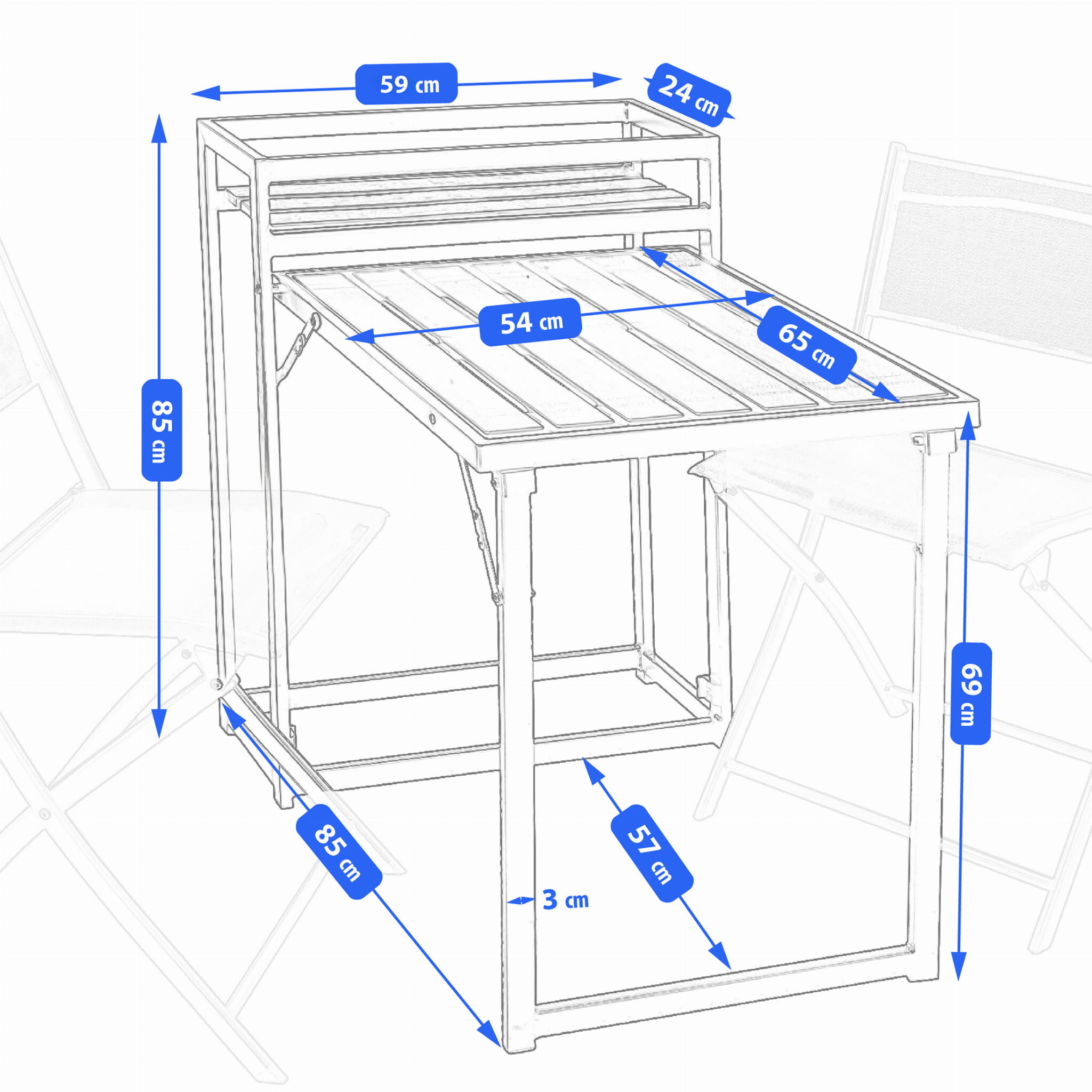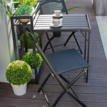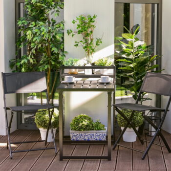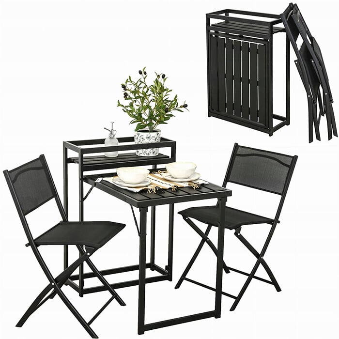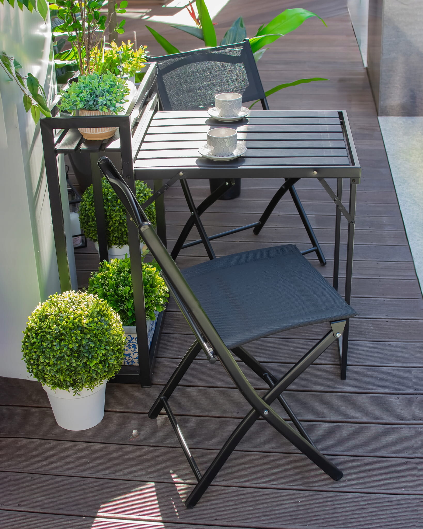 Izberite ta zložljivi balkonski komplet za ustvarjanje prijetnega zunanjega kotička, ki združuje praktičnost, udobje in sodoben videz za kateri koli zunanji prostor.