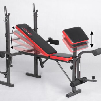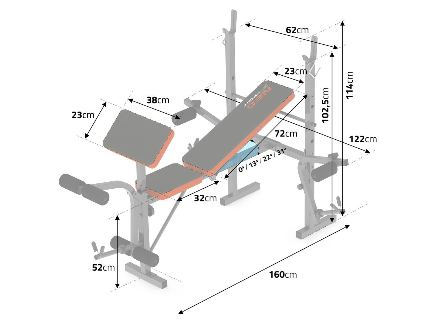 - ⚙️ Nastavljiv hrbtni naslon : 4 stopnje naklona (0°, 13°, 22°, 31°) omogočajo prilagoditev različnim vajam in potrebam uporabnika.