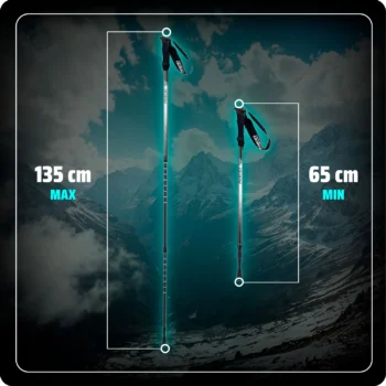 ◾ Razpon od 65 cm do 135 cm – palice so teleskopske, kar omogoča enostavno nastavitev dolžine in prilagajanje uporabnikovi višini ter vrsti terena, po katerem se giblje. ✔ Zahvaljujoč temu jih je mogoče udobno nositi v nahrbtniku ali pa jih zložene pritrditi na zunanjo stran nahrbtnika.