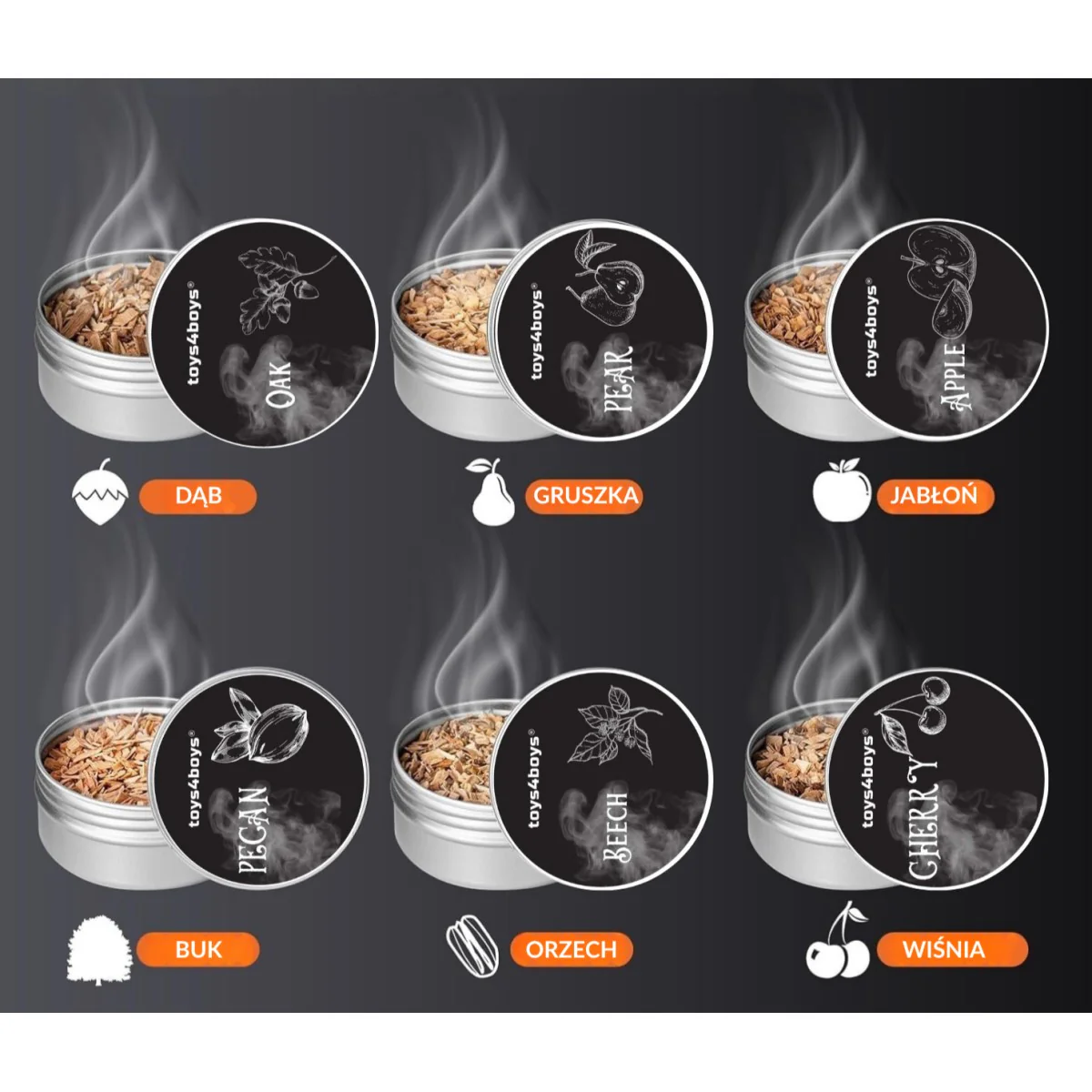 Bogati okusi – Komplet vsebuje 6 vrst naravnih sekancev: hrastovega, jabolčnega, pekan oreha, češnjevega, hruškovega in bukovega.
