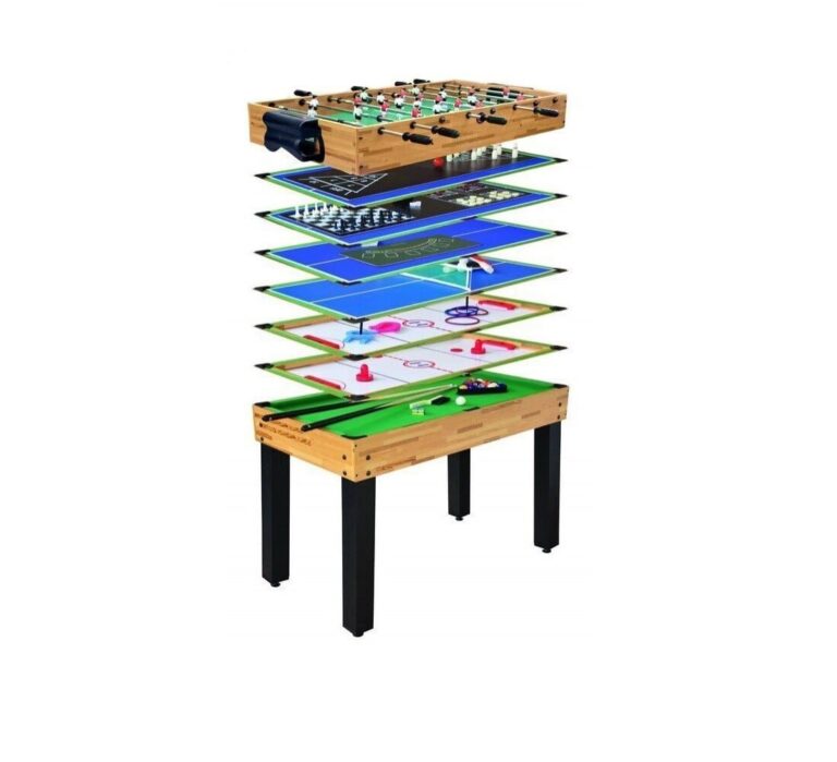 Biljardni del kompleta vključuje: – dimenzije mize približno 55/103 cm – 2 leseni palici, vsaka dolga približno 92 cm, – 17 žogic, – trikotnik, – 2 kocki krede, – metla.