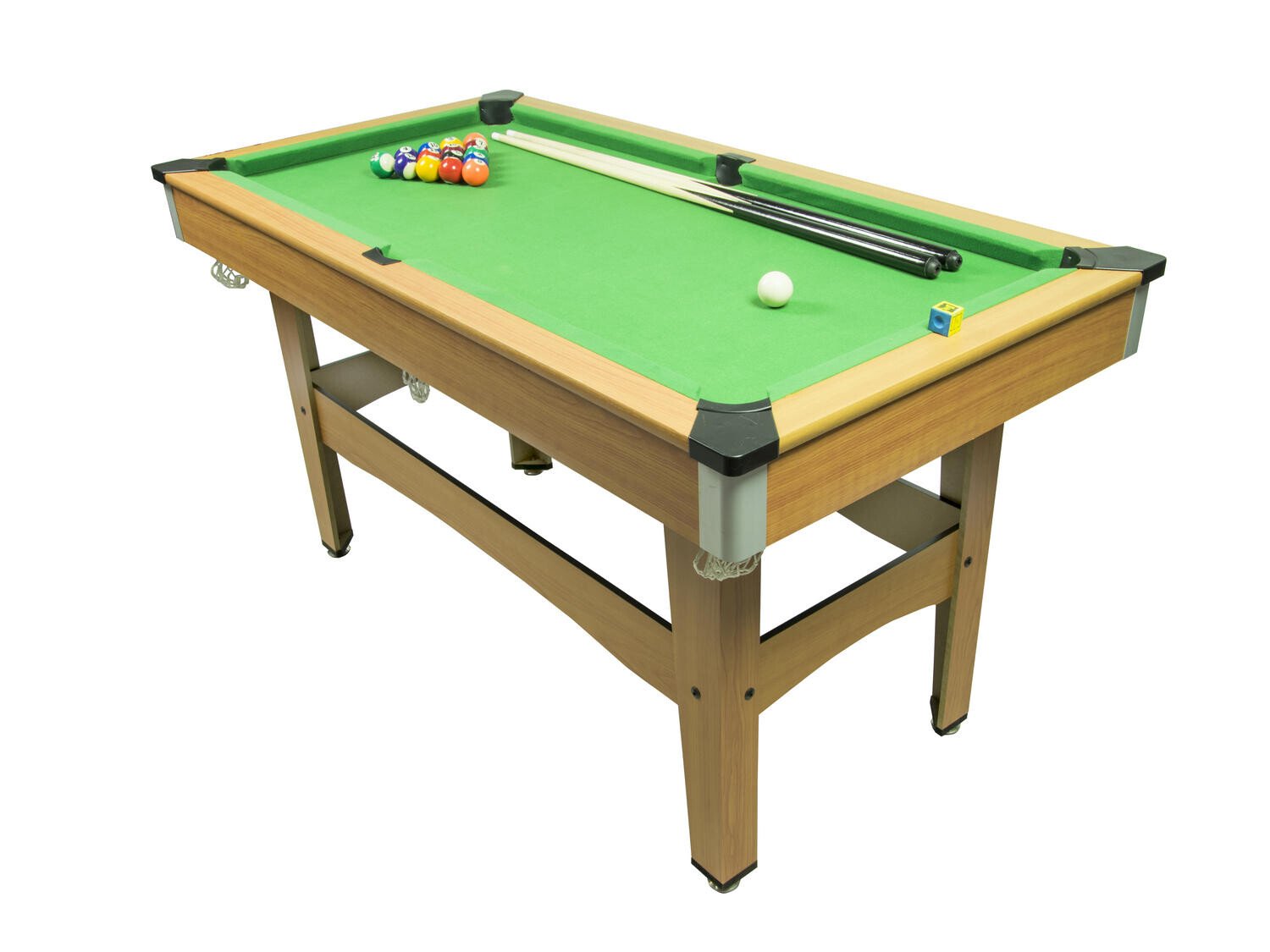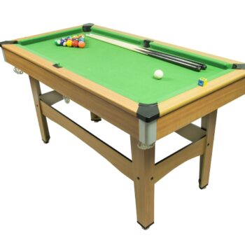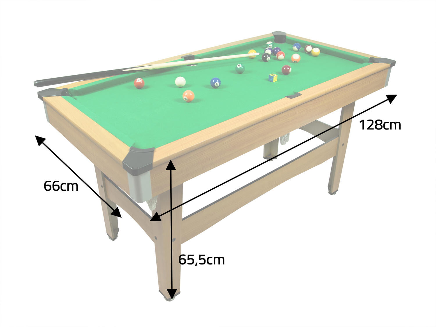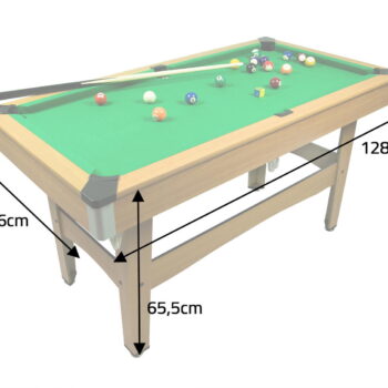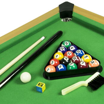 Velikost mize vam omogoča igro kjer koli v stanovanju. Igrate lahko tako v dnevni sobi kot v otroški sobi. Poleg tega je predstavljena miza dovolj lahka, da jo lahko enostavno premaknete na mesto, kjer otrok trenutno želi igrati igro. Miza stoji trdno in stabilno, tako da se otroci lahko osredotočijo na užitek igranja. Komplet vključuje celoten komplet dodatkov, tj. 2 biljardni palici, 16 krogel, trikotnik, biljardno kredo in čistilno krtačo. Z eno besedo, popolna profesionalnost! Ravno pravi čas za usposabljanje mladega biljardnega mojstra.
