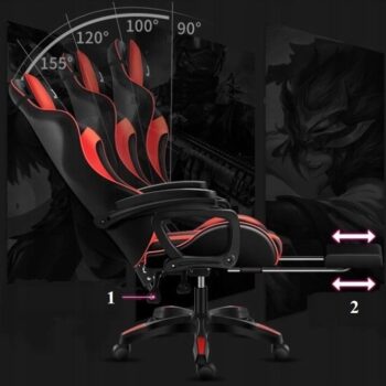 Zahvaljujoč možnosti nastavitve višine sedeža in nastavitve kota naslonjala (1) se bo stol prilagodil uporabniku ne glede na njegovo višino. Nastavitev kota naslonjala zagotavlja udobno uporabo – po izbiri udobnega položaja je mogoče naslonjalo zakleniti. Stol ima tudi nastavljiv naslon za noge (2). Stol je opremljen z dvema blazinama za glavo in hrbtenico . Obe blazini sta nastavljivi s trakovi, pritrjenimi z zaponkami, kar preprečuje premikanje in vam omogoča, da ju namestite v udoben položaj. Poleg tega ima blazina za hrbtenico funkcijo masaže, zaradi katere se boste počutili kot v najboljši igralnici.