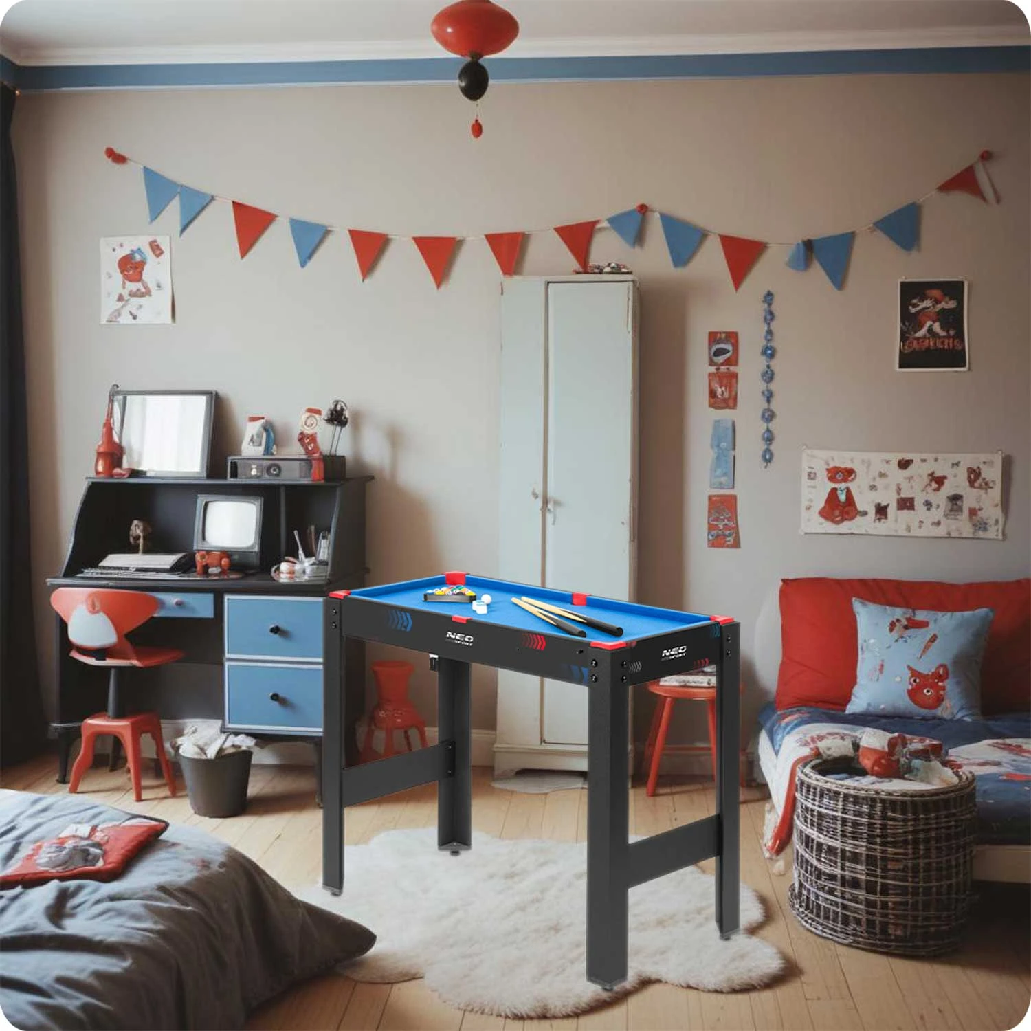 Miza z dodatno košarkarsko funkcijo – NS 810 pomeni še več športnih čustev! V hipu jo lahko spremenite v košarkarsko mizo, zahvaljujoč posebnemu pokrovu pa se boste izognili nenamernim udarcem z mize. Odlična zabava in tekmovanje zagotovljeno, tako za prijatelje kot za otroke!