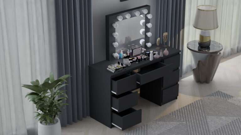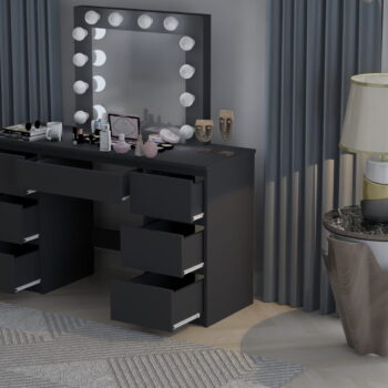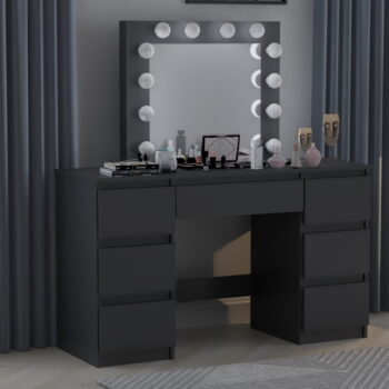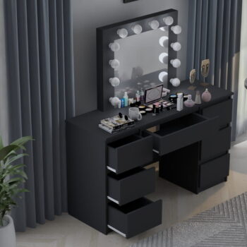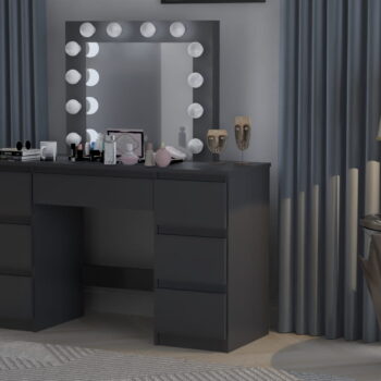 Kozmetična toaletna mizica BETI z ogledalom in 12-žarnično LED osvetlitvijo je izdelana z veliko skrbnostjo in se bo zato popolnoma podala v vašo spalnico. Izdelana je iz visokokakovostne laminirane plošče debeline 16 mm in PVC furnirja debeline 0,8 mm, zaradi česar so vogali toaletne mizice urejeni in trpežni, sama mizica pa je odporna na praske. Nevtralna LED osvetlitev bo zagotovila enostavno uporabo toaletne mizice. Mizica ima sedem prostornih predalov, ki ponujajo veliko prostora za shranjevanje, in ogledalo, ki je trajno pritrjeno na mizico.