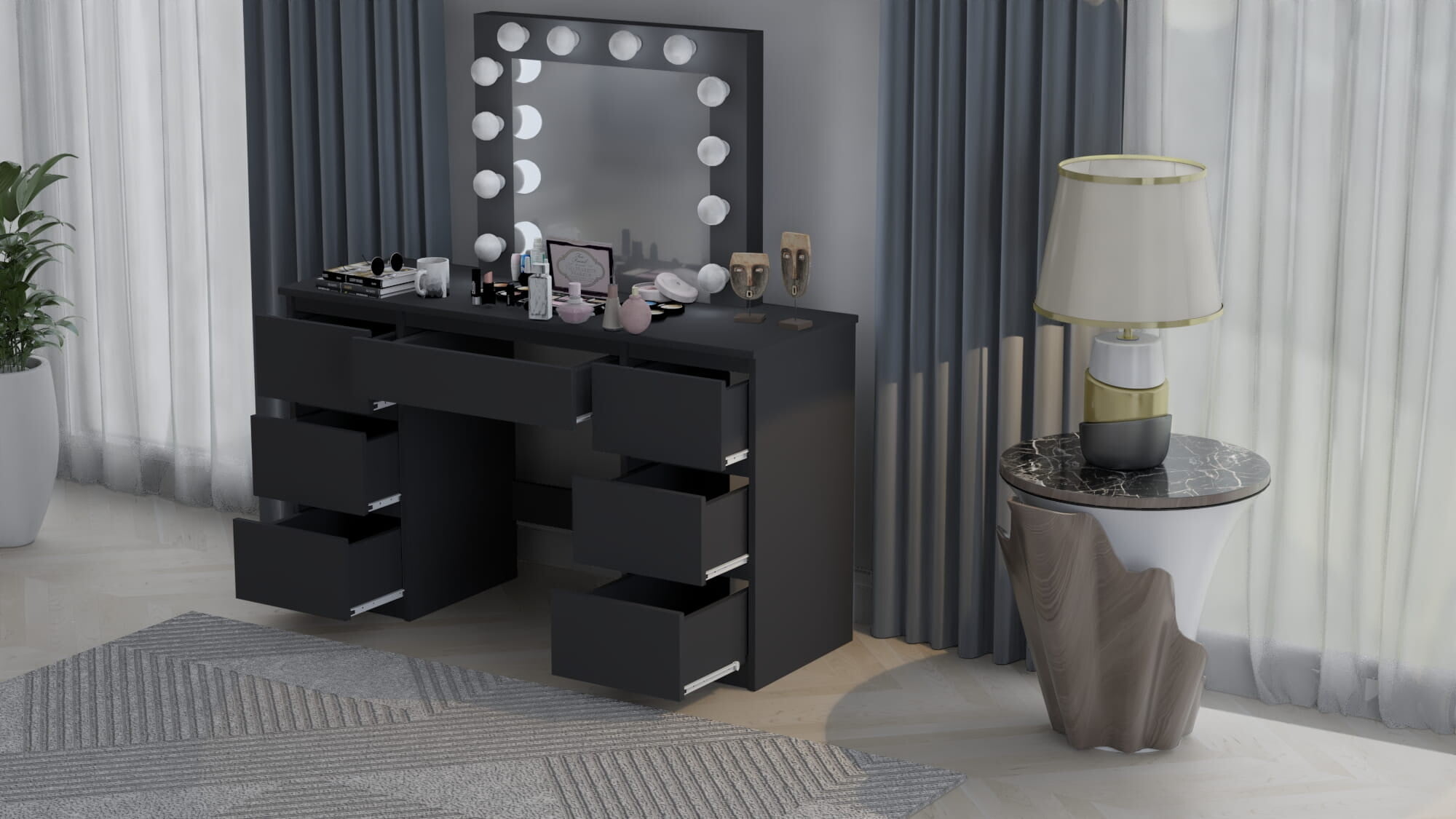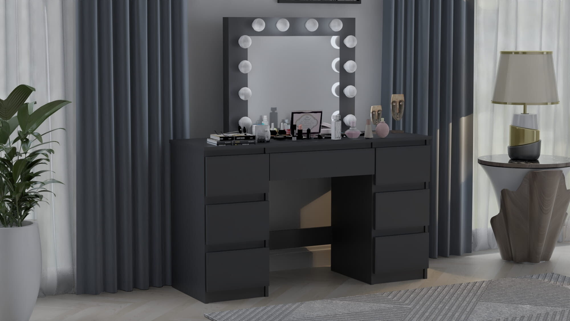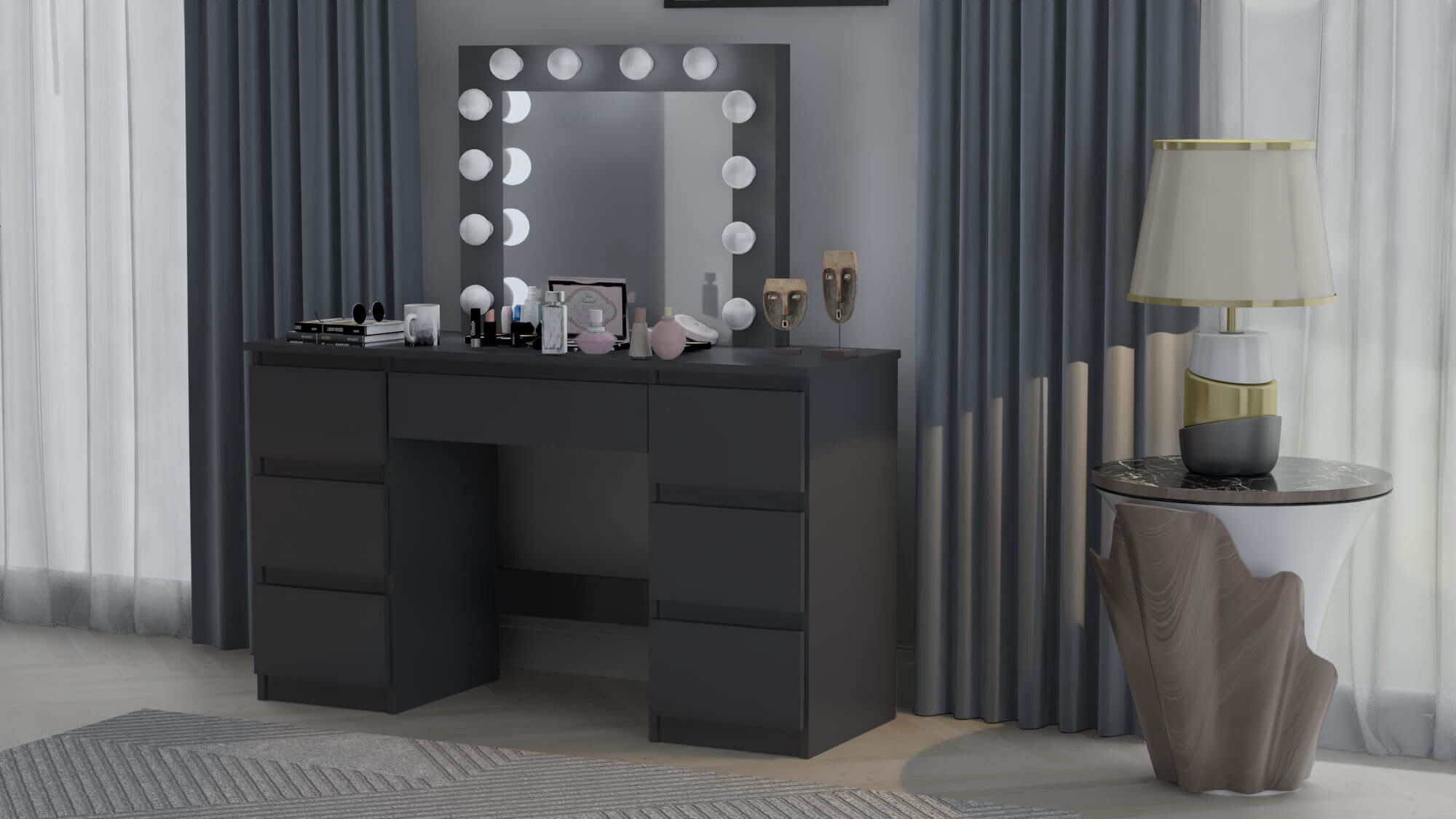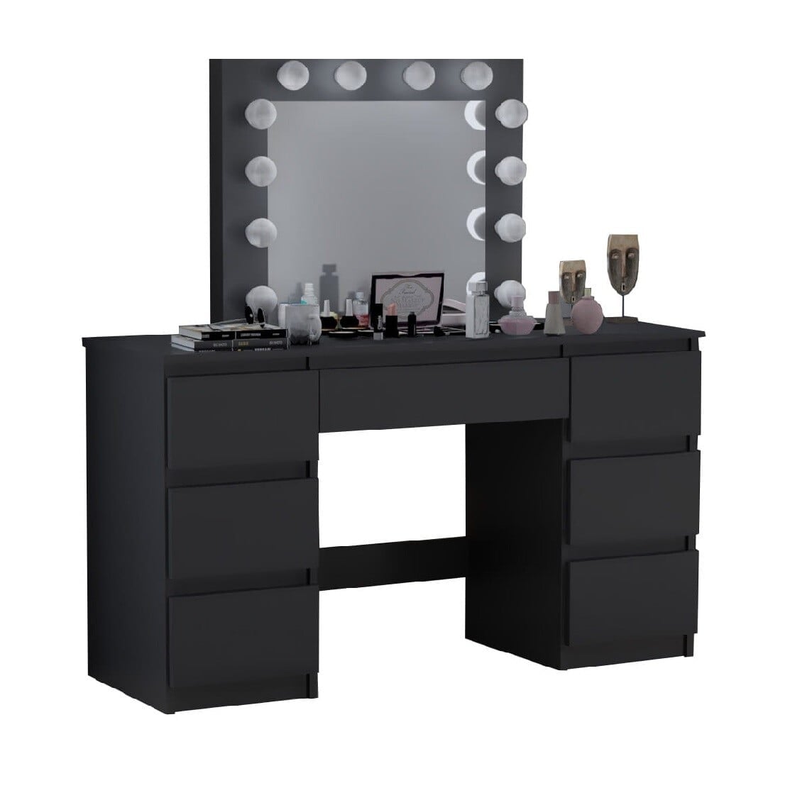 Kozmetična toaletna mizica BETI z ogledalom in 12-žarnično LED osvetlitvijo je izdelana z veliko skrbnostjo in se bo zato popolnoma podala v vašo spalnico. Izdelana je iz visokokakovostne laminirane plošče debeline 16 mm in PVC furnirja debeline 0,8 mm, zaradi česar so vogali toaletne mizice urejeni in trpežni, sama mizica pa je odporna na praske. Nevtralna LED osvetlitev bo zagotovila enostavno uporabo toaletne mizice. Mizica ima sedem prostornih predalov, ki ponujajo veliko prostora za shranjevanje, in ogledalo, ki je trajno pritrjeno na mizico.