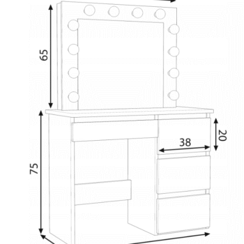 Okoli ogledala je kar 12 LED žarnic v najboljši barvi za profesionalno ličenje – nevtralno beli , ki zagotavlja popolno osvetlitev kože. Stikalo za luč se nahaja ob strani ogledala – uporaba je intuitivna, diskretno skrita, do toaletne mizice vodi 180 cm dolg kabel. Dimenzije ogledala so širina 80 cm, višina 65 m in globina 10 cm. Varen izdelek – ima izjavo CE o skladnosti . Barva svetlobe: nevtralna Barvna temperatura: [K] 4000 Energijsko varčna žarnica, ki se ne segreva.