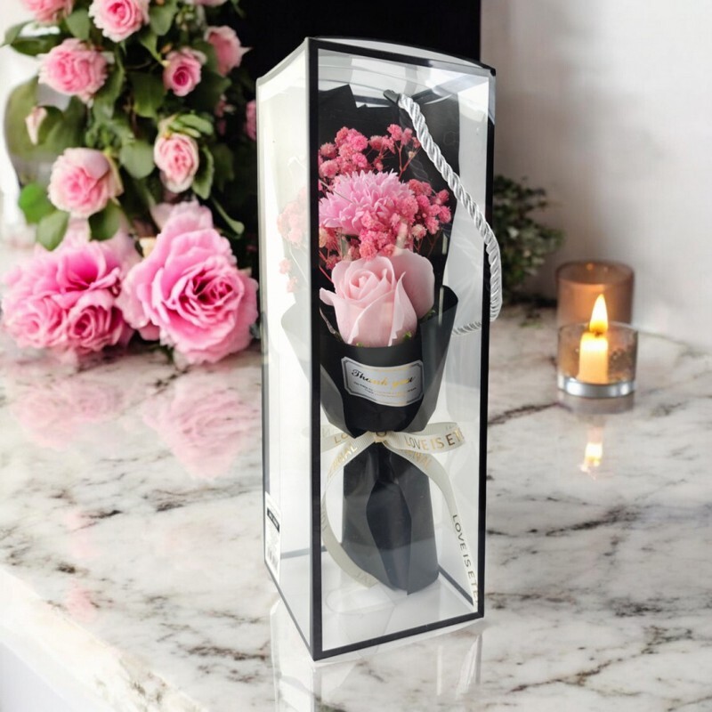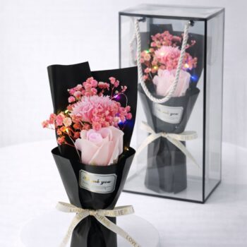 Šopek dišečih milnih vrtnic v darilni škatli z LED osvetlitvijo (BUK08) je elegantna dekoracija in že pripravljeno darilo “na prvi pogled” – vrtnice so izdelane kot milne rože in nameščene v dekorativni embalaži s pentljo, v notranjosti pa so LED lučke s 3 načini osvetlitve .