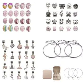 • Raznolikost materialov: Komplet vsebuje široko paleto perlic, obeskov in dodatkov v različnih oblikah, velikostih in barvah, kar vam daje neomejene možnosti oblikovanja.