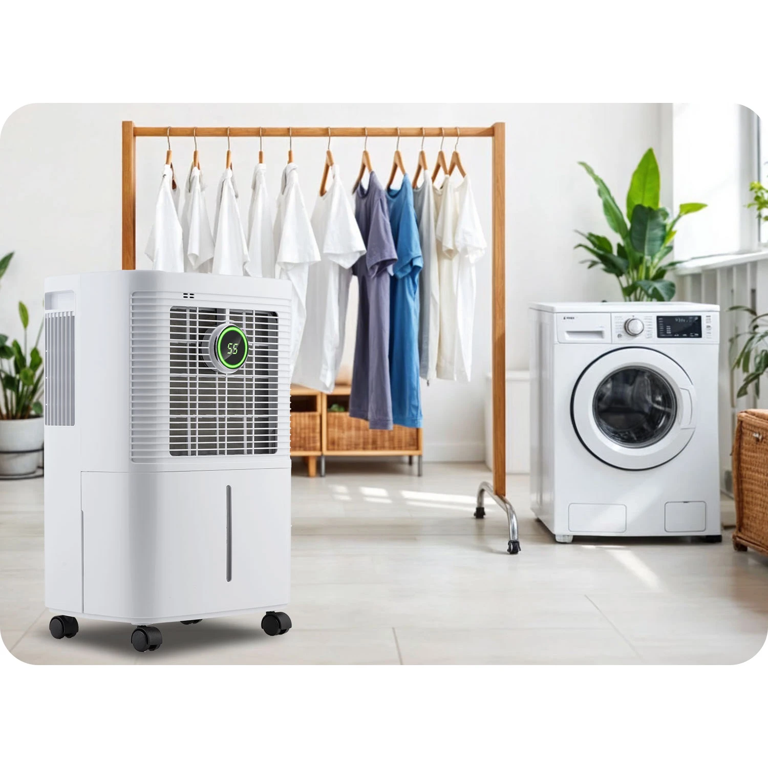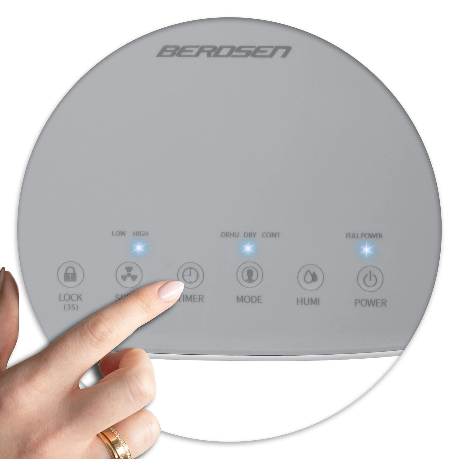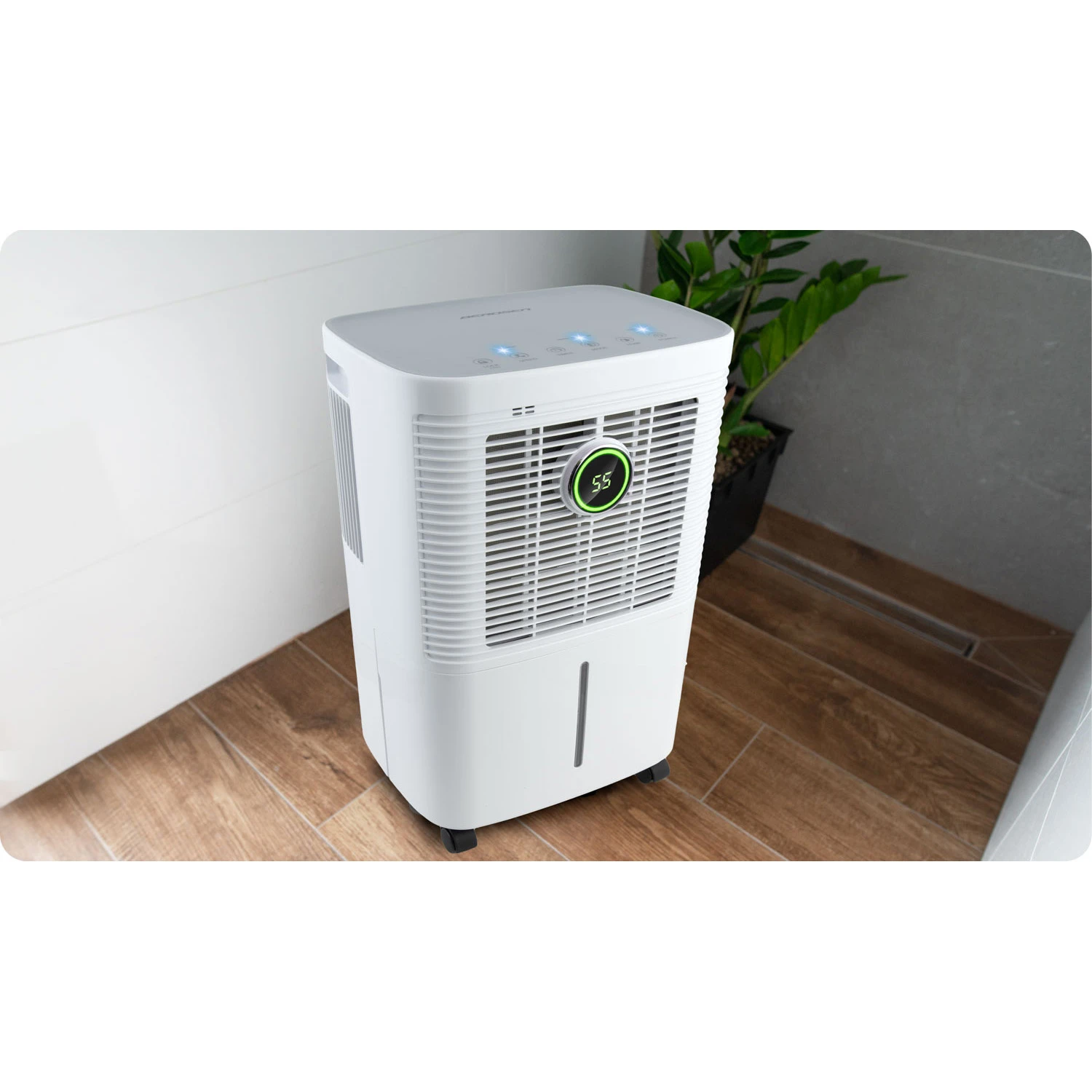 Sodobna, na dotik občutljiva nadzorna plošča na vrhu razvlažilnika zagotavlja maksimalno udobje uporabnika. Omogoča vam prilagajanje vseh obratovalnih parametrov. Sprednji zaslon prikazuje trenutno vlažnost v prostoru.