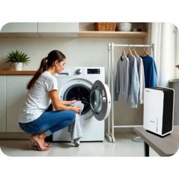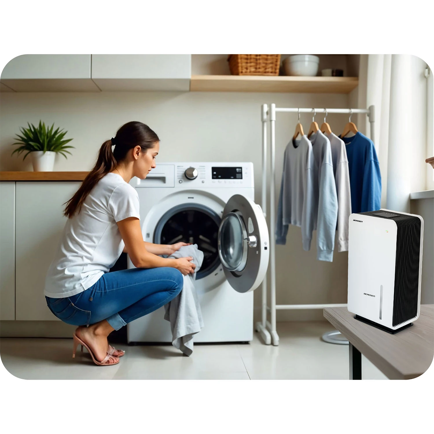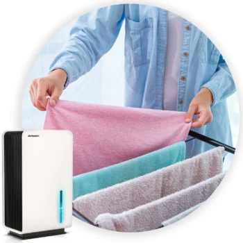 - Skrajša čas sušenja oblačil – razvlažilnik zraka intenzivno suši zrak in pospeši naravni proces izhlapevanja vlage iz perila.