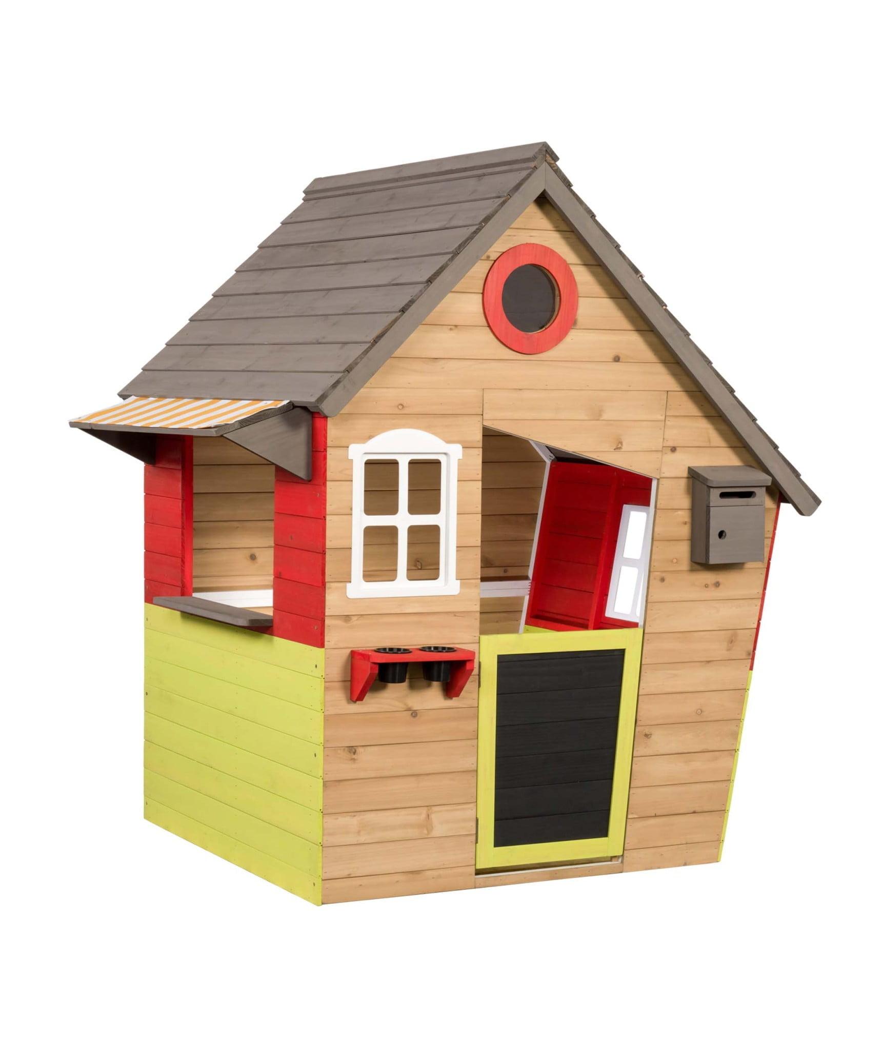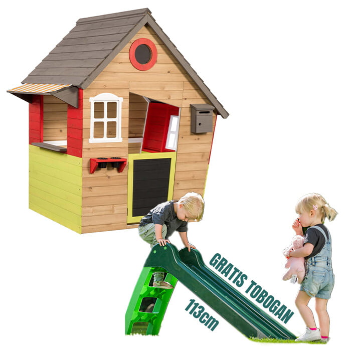 Proizvodnja v EU – Nizozemska ♻️ Izdelano iz impregniranega lesa s certifikatom FSC® Dimenzije: 140 x 106 x 145 cm ️ Barvan les FSC ne potrebuje nadaljnje obdelave BREZPLAČEN TOBOGAN OB NAKUPU HIŠE