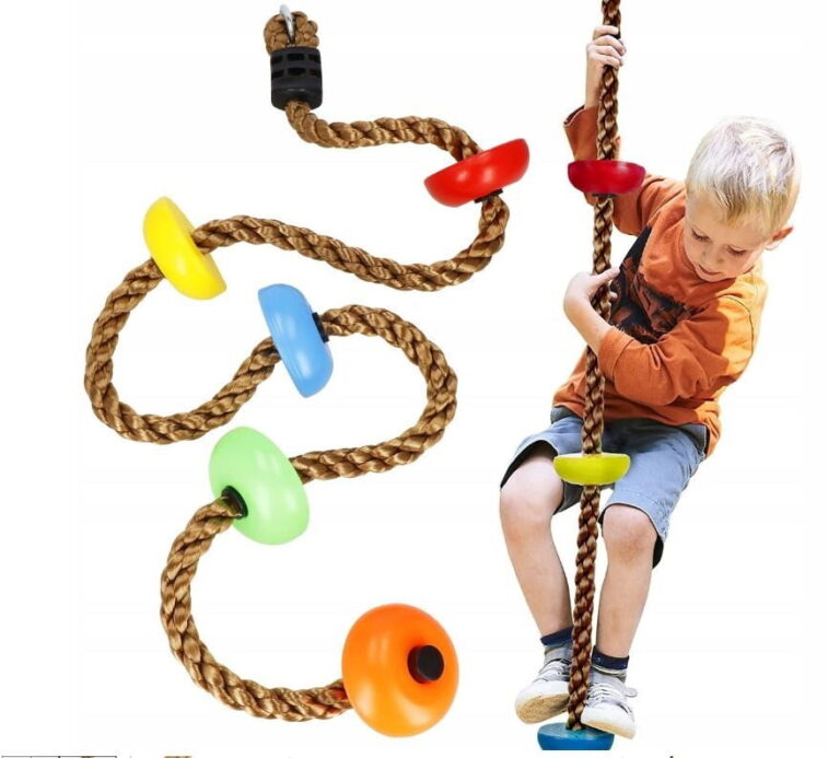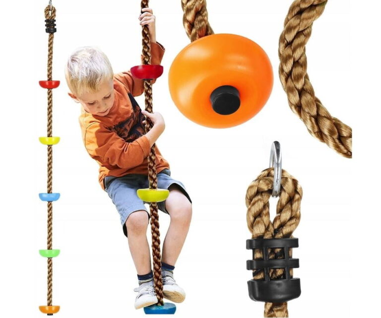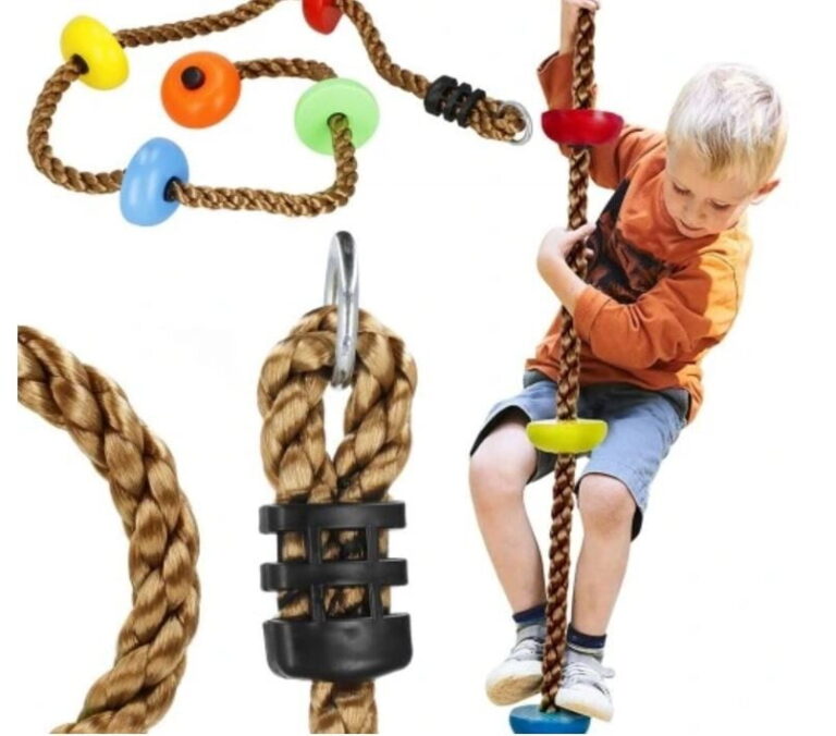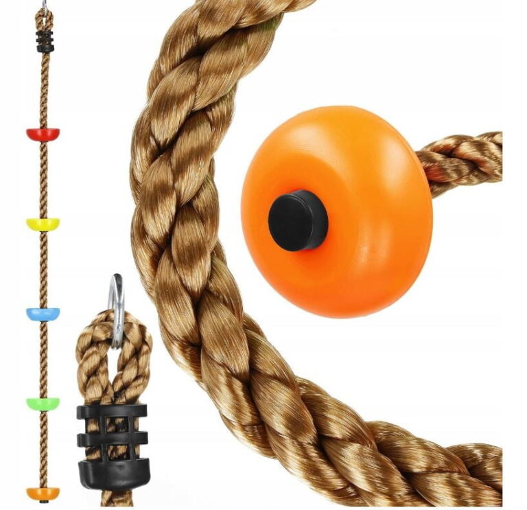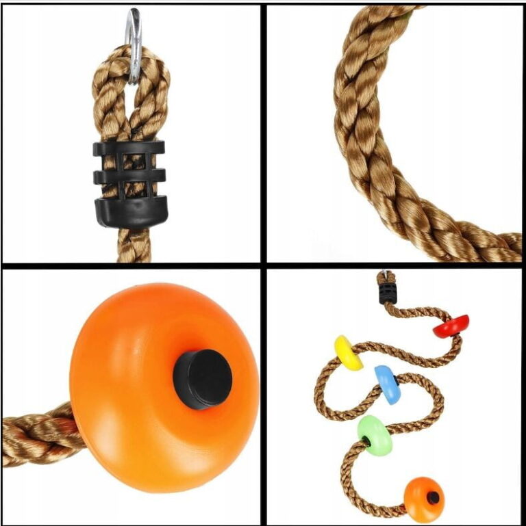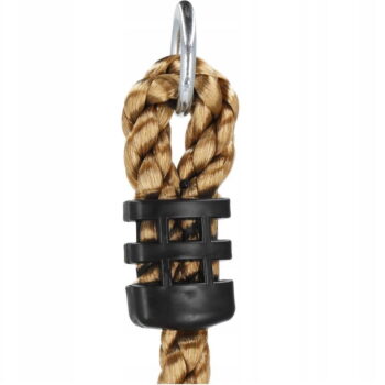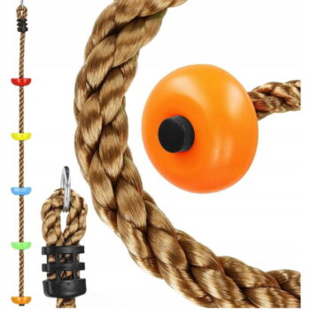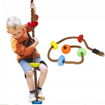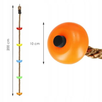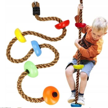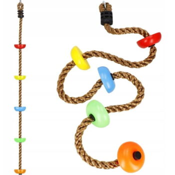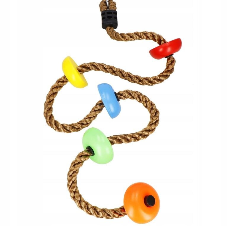 PLEZALNA VRV z okroglimi stopnicami Znamka: Springos® Število stopnic: 5 Barva vrvi: rjava Barva stopnic: večbarvna (oranžna, zelena, rumena, modra, rdeča) Kovinski pritrdilni obroč na vrhu vrvi Za otroke, starejše od 3 let Nedrseča površina na stopnicah Največja nosilnost: 150 kg