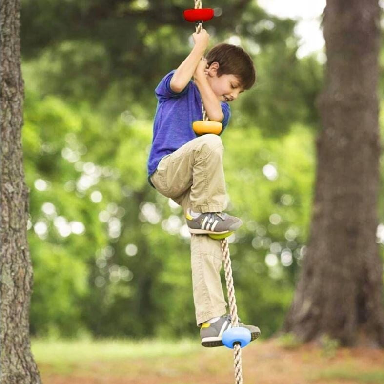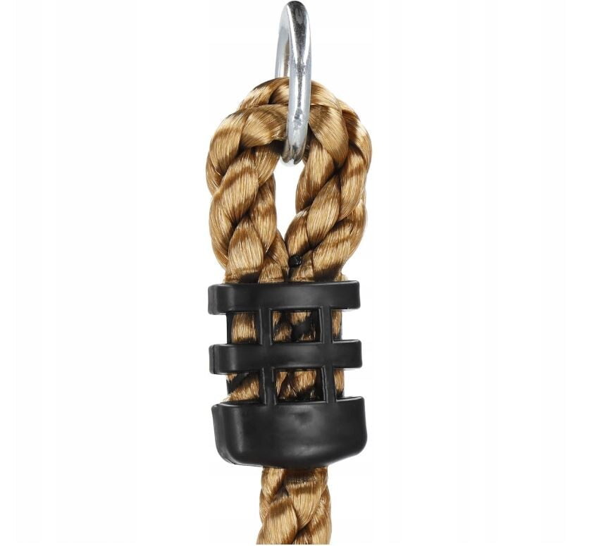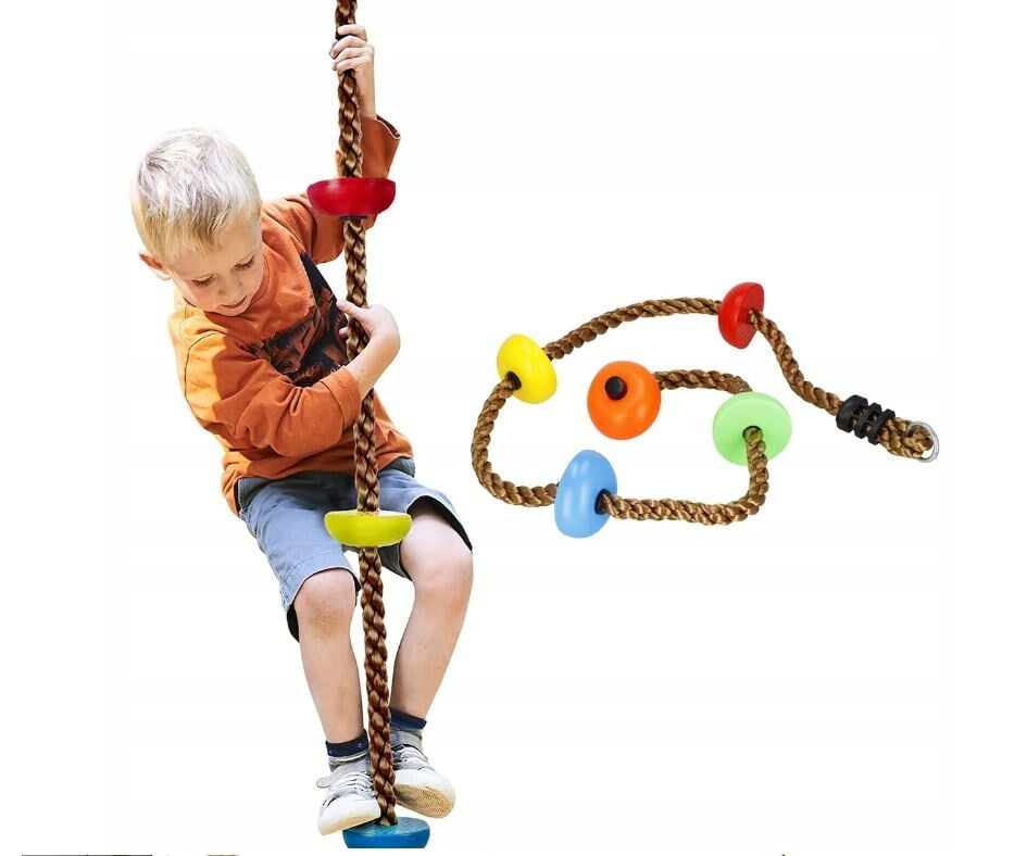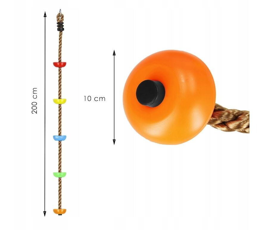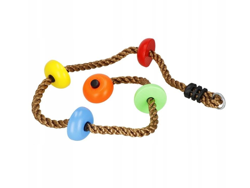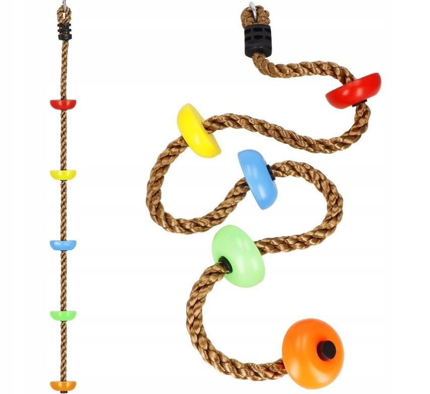 PLEZALNA VRV z okroglimi stopnicami Znamka: Springos® Število stopnic: 5 Barva vrvi: rjava Barva stopnic: večbarvna (oranžna, zelena, rumena, modra, rdeča) Kovinski pritrdilni obroč na vrhu vrvi Za otroke, starejše od 3 let Nedrseča površina na stopnicah Največja nosilnost: 150 kg
