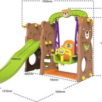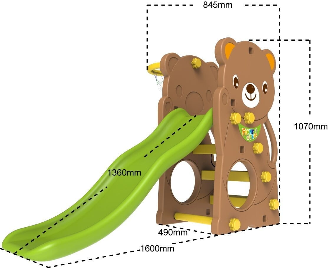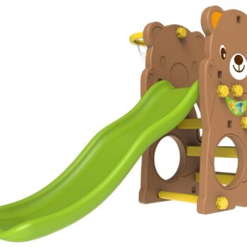 Specifikacije Gugalnica s toboganom 3 v 1 Vsi elementi tobogana/gugalnice so izdelani iz visokokakovostnega HDPE materiala. Gre za polietilen visoke gostote, od 0,942 do 0,965 g/cm3. HDPE je fleksibilen material in odporen na mehanske poškodbe. Vse stene in komponente so izdelane iz dvojne plastike. To dodatno omogoča polnitev sten v obliki peska. Veliki deli olajšajo montažo. Opis – široka stabilna gugalnica, – sedež z odstranljivo zaščito, – togi upogibi gugalnice, kar izboljša stabilnost med igro, – široke ojačane konstrukcije platforme, – visok naslon gugalnice, – dolgo obstojen drsni tobogan iz dvojne plastike, – širše varne stopnice drsnika, – košarkarski obroči z mrežo, – žoga za igro, – konstrukcija gugalnice, ki omogoča spreminjanje videza konstrukcije. Dimenzije – dolžina 131 cm, – širina 160 cm, – višina 126 cm, – dolžina tobogana 136 cm, – dolžina s košarkarskim košem 163 cm, – dimenzije in teža v paketu: 137 x 37 x 64 cm / 17 kg, otroška gugalnica promodan