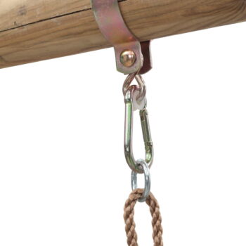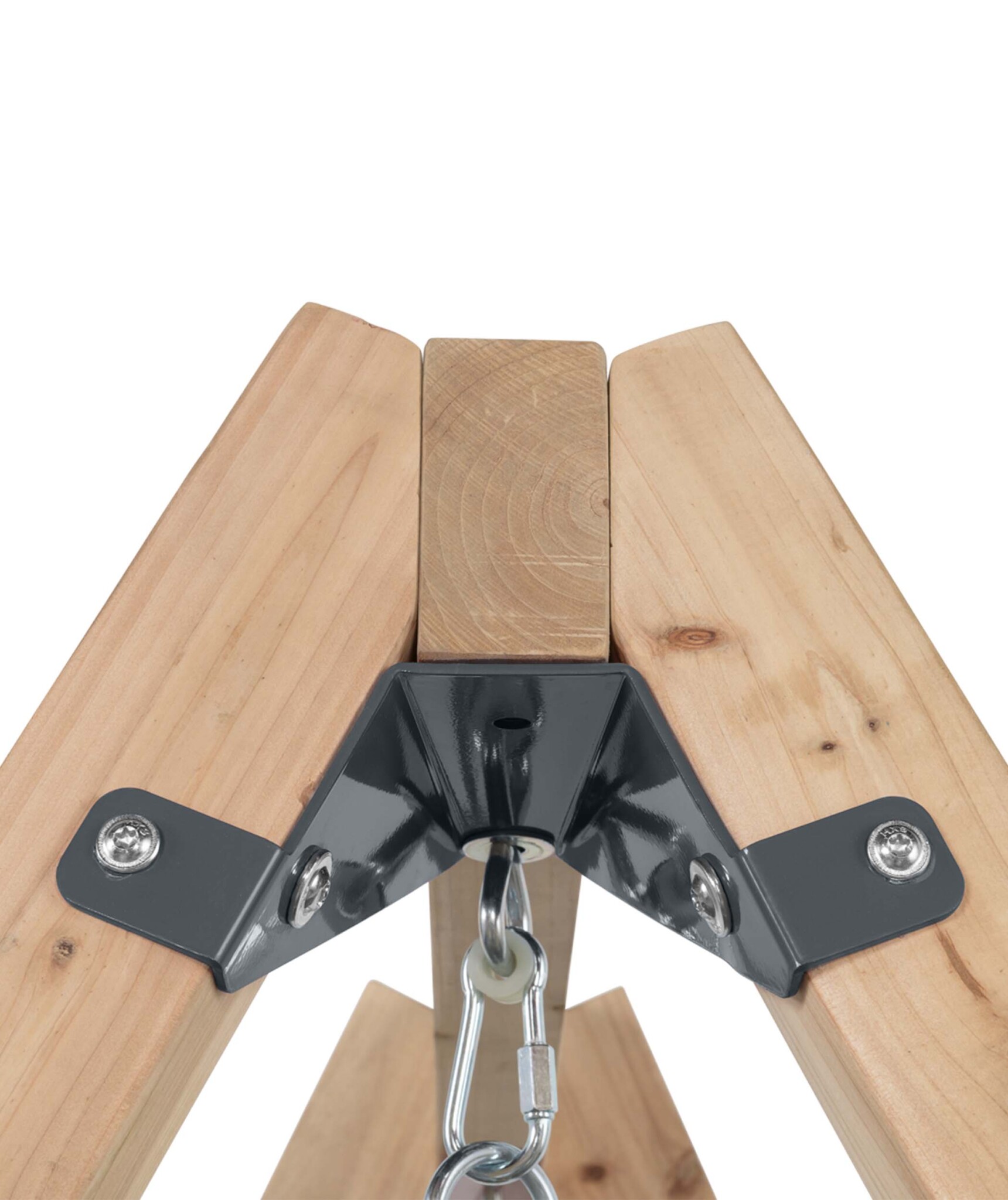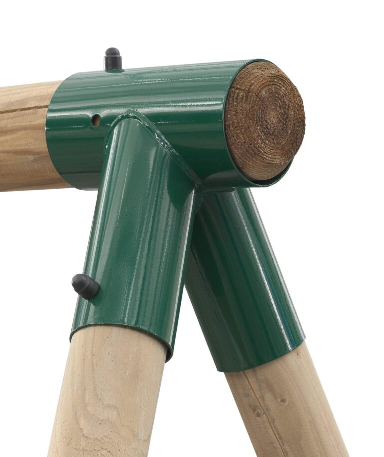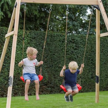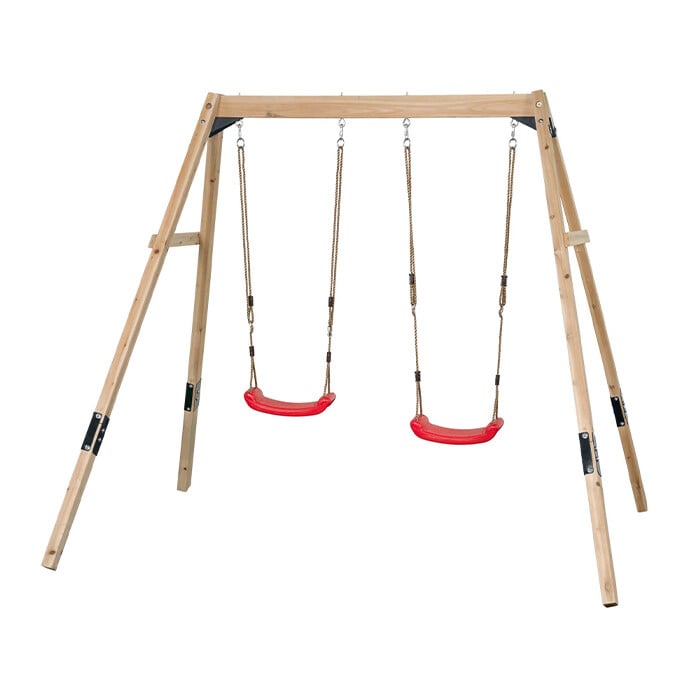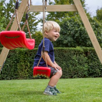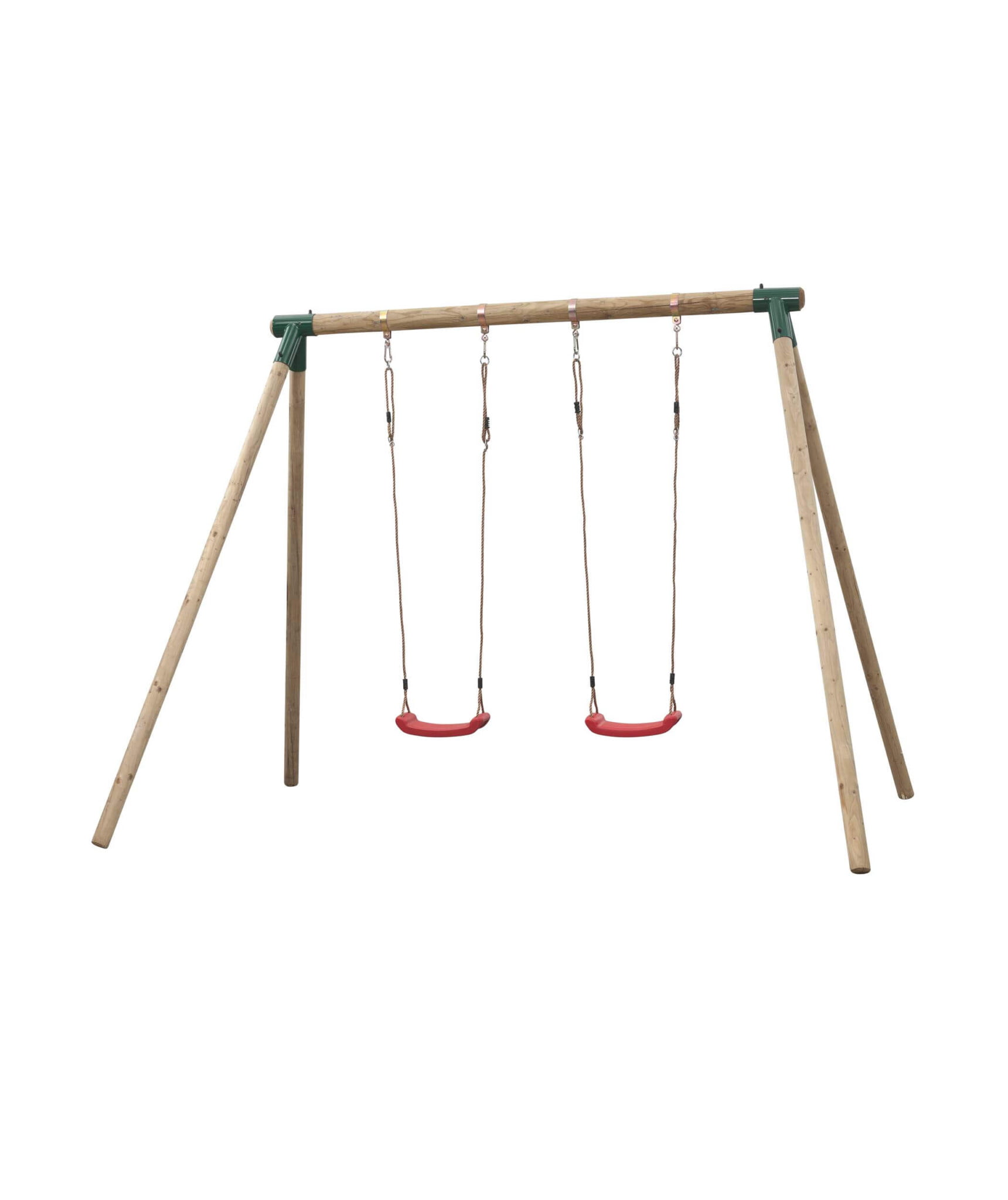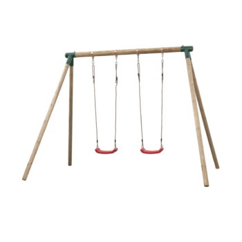 Gugalnica za otroke – Swing King Dvojna gugalnica iz trdno impregniranega lesa s certifikatom FSC®, ki traja leta. Lesa ni treba obdelovati. Zahvaljujoč impregnaciji pod pritiskom je dvojna gugalnica za otroke na ogrodju odporna na neugodne vremenske razmere – dež, sneg, veter ter nizke in visoke temperature. Poleg tega se dobro spopada z UV-žarki, ne da bi pri tem izgubila svoj lep videz. Sedeže gugalnice je mogoče zamenjati z drugimi dodatki. Priporočljiva je uporaba zemeljskih sider (niso priložena). Dimenzije: dolžina: 250 cm, širina: 220 cm, višina: 220 cm. Primerna za postavitev na površine približno 25 m² Primerno za starost: 3-12 let