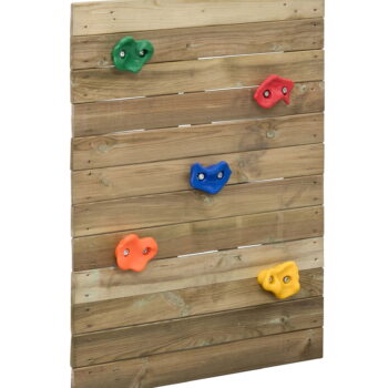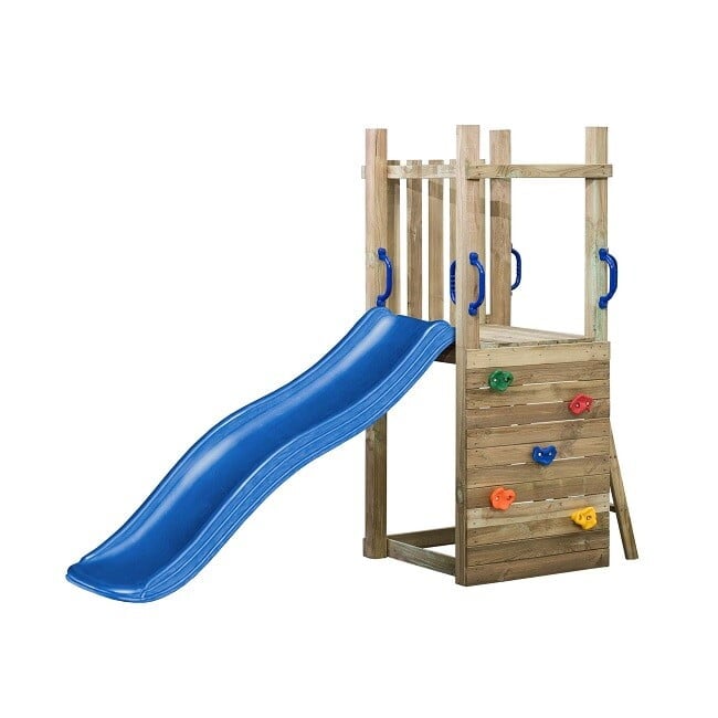 Igrišče z 1,75 m dolgim ​​modrim toboganom, plezalnimi skalami in tremi kompleti ograj. Plezalni stolp je izdelan iz impregniranega lesa s certifikatom FSC®, ki bo zdržal leta. Zaradi proizvodnega procesa kvadratnega lesa je verjetnost površinskih razpok majhna. Ta postopek je bolj zamuden, vendar les postane bolj trajnosten. Vključno s sidri za tla. Specifikacije: Dimenzije: – 30 m2 – 70 x 160 x 175 cm Starost: 3-8 let Igrišče in zabava na prostem