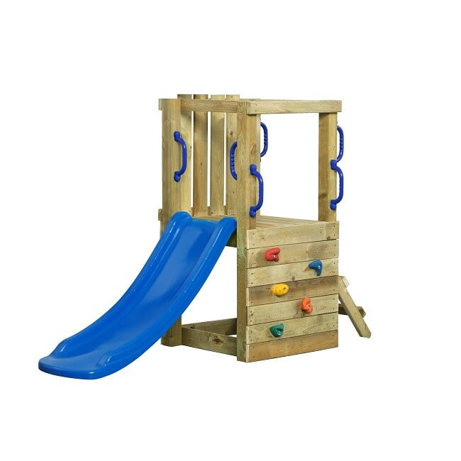 Igrišče z 1,2 m dolgim ​​modrim toboganom, plezalnimi skalami in tremi kompleti ograj. Plezalni stolp je izdelan iz impregniranega lesa s certifikatom FSC®, ki bo zdržal leta. Priložena so talna sidra. Specifikacije: Dimenzije: 20 m2 66 x 190 x 125 cm Starost: 2 – 5 let Igrišče in zabava na prostem