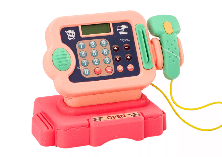 Blagajna Frisky za otroke omogoča simulacijo nakupovanja, vsebuje košarico z izdelki, bankovci, kovanci in kreditnimi karticami. Digitalni zaslon omogoča matematične operacije. Realistični zvoki in svetlobni učinki naredijo nakupovanje še bolj zanimivo. 🙂