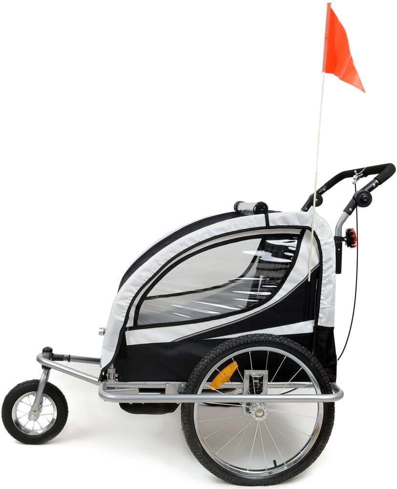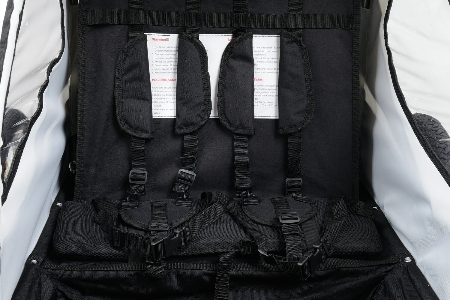 VAREN NASTAVLJIV ROČAJ Ročaj ima penasto prevleko, ki zagotavlja trden oprijem. Je mehak in nedrseč. Zahvaljujoč dvema gumboma lahko nastavimo položaj ročaja (9 položajev). ROČNA ZAVORA NA ROČAJU Prikolica je opremljena z učinkovito zavoro, ki blokira dve veliki kolesi. Zavorna ročica je na ročaju. ZASTAVICA Priložena zastavica vam bo omogočila, da signalizirate prisotnost prikolice z velike razdalje. HITRA SESTAVLJANJE MALEGA VRTEČEGA KOLESA S pomočjo dveh gumbov lahko hitro premaknete sprednje kolo na zadnji del prikolice. To nam omogoča, da prikolico hitro spremenimo v tekaško vozilo. Kolo je mogoče nastaviti v način vrtenja ali zaklepanja, zaradi česar je usmerjeno v eno smer. NAPOLNJENA KOLESA Vsa kolesa so napihnjena, kar odpravlja udarce in povečuje udobje vožnje. PREVLEKA Prevleka bo zaščitila notranjost kabine pred vetrom, dežjem ali sončno svetlobo. Sprednje okno prikolice je sestavljeno iz mreže proti komarjem in dodatno zvitega dežnega plašča. Mreža omogoča vstop zraka v kabino, hkrati pa ščiti pred žuželkami. PRTLJAŽNIK Na zadnjem delu prikolice je prostoren prostor za shranjevanje z visoko steno. Dovolj je prostoren za shranjevanje igrač, oblačil, živil in še veliko več. Majhno kolo, pritrjeno na zadnji del prikolice, ne bo zmanjšalo prostornine prtljažnika. GARANCIJA ZA VARNO POTOVANJE Sredinski del prikolice je opremljen z varnostnimi pasovi, ki zagotavljajo varnost naših otrok. Na sedežu je blazina za udobno sedenje. V prikolici je prostor za noge, medtem ko otrok sedi, se udobno vozi, ker so njegove noge nižje. Ko so mu čevlji umazani, se vsa umazanija na tem mestu ne širi v notranjost. MOŽNOST PREVOZA DVEH OTROK Število pasov in prostor v prikolici sta zasnovana za prevoz dveh otrok.