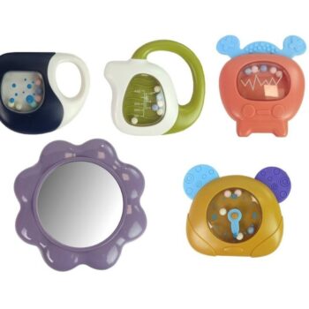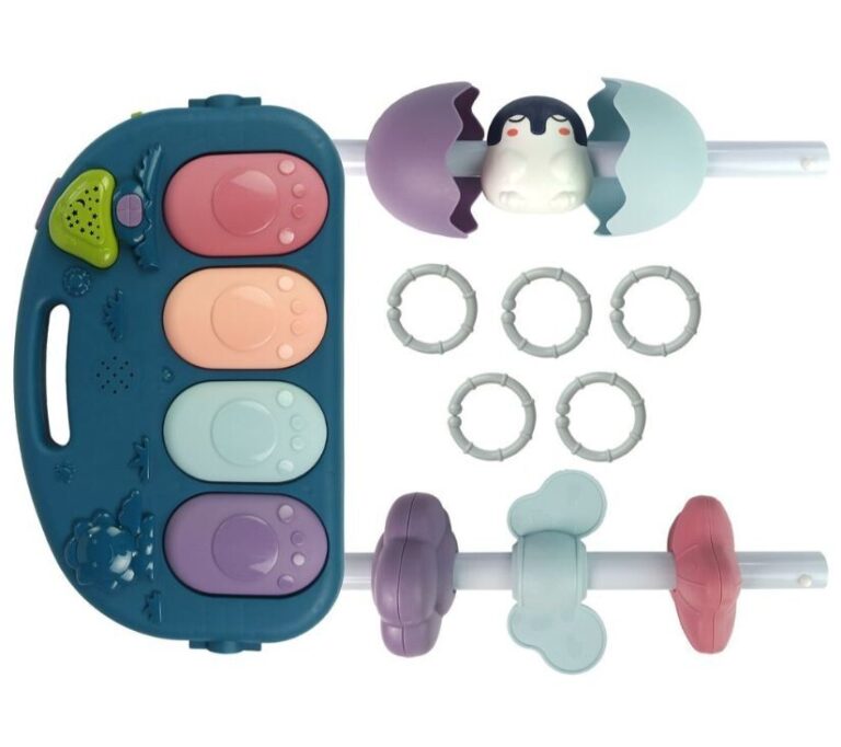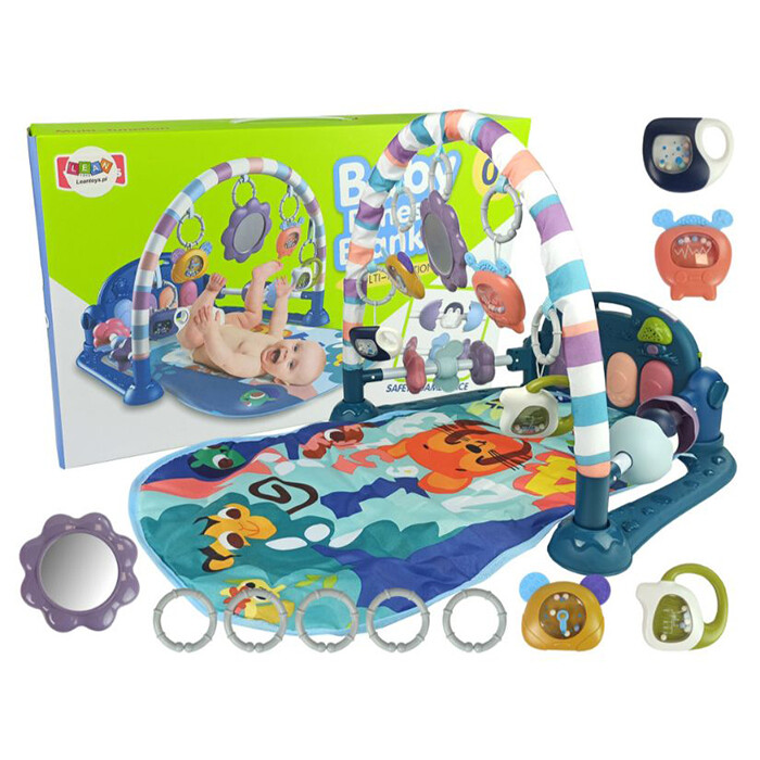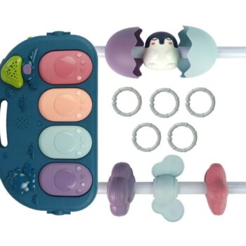 Podloga za dojenčke s penastimi ropotuljicami. Podloga lahko spremlja otroka že od prvih dni njegovega življenja in podpira njegov razvoj. Zato se splača priskrbeti igrače, ki bodo igro naredile varno in zabavno. Barvite grafike in vzorci bodo pomagali razviti otrokov vid, obešalni elementi pa bodo razvili funkcijo prijemanja, hkrati pa bodo vzbudili otrokovo radovednost. Živahne barve in vzorci bodo pritegnili pozornost tudi najbolj nemirnih dojenčkov. Komplet vsebuje klavir na baterije, s pritiskom na tipke pa boste slišali vrsto zvokov, ki prihajajo iz zvočnikov. Nad njim visijo različni zvončki v obliki ure in televizijski sprejemnik z gumijastimi vrhovi. Elementi kompleta: – podstavek – ogledalo – klavir – ropotuljice Dimenzije zloženega polnega podstavka: 72 cm x 48 cm x 38 cm Višina podstavka približno 35 cm Dimenzije klavirja: 30 cm x 18 cm x 4 cm Dimenzije ene ropotuljice: približno 10 cm x 8 cm x 3 cm Dimenzije škatle: 47 cm x 30 cm x 9 cm Podstavek je namenjen dojenčkom takoj po rojstvu. Komplet ima certifikat CE in je skladen z EN 71. Pakiran je v kartonski škatli, zaradi česar je idealno darilo. Klavir napajajo tri priložene baterije AA 1,5 V.