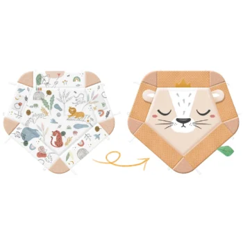 Hrbtna stran blazine je izdelana iz blaga v slogu minky, je izjemno mehka in udobna. Na blazino je mogoče pritrditi igrače . Levja ušesa šumijo!