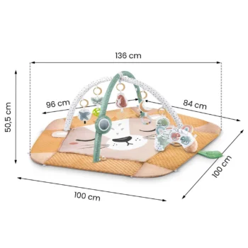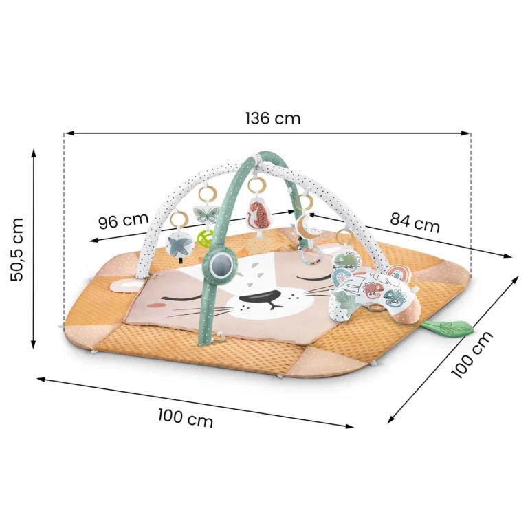 - Komplet vključuje: podstavek, 5 sten, 2 naglavna trakova, 7 večnamenskih igrač, vključno z BREZPLAČNO blazino za trebušček ,