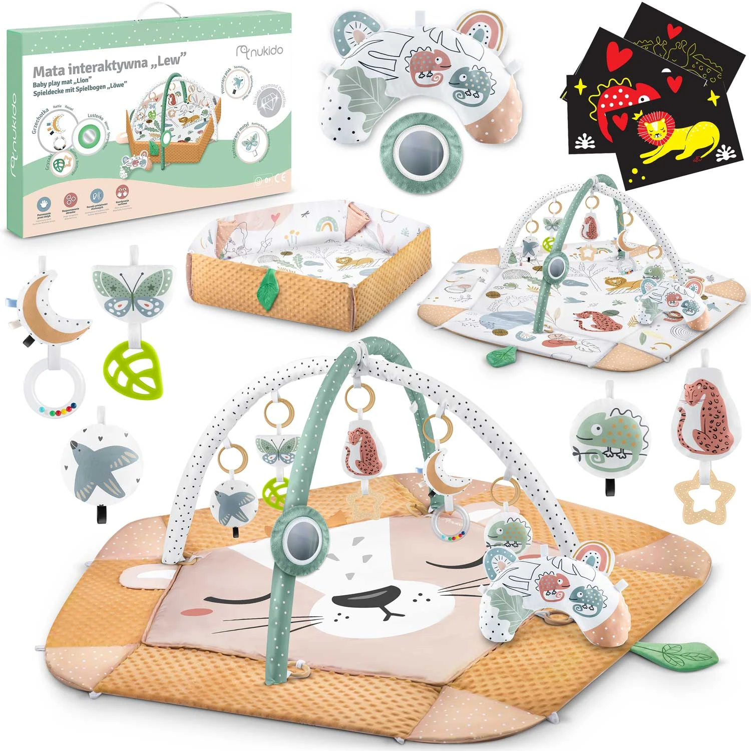 - Komplet vključuje: podstavek, 5 sten, 2 naglavna trakova, 7 večnamenskih igrač, vključno z BREZPLAČNO blazino za trebušček ,