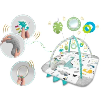 … pri treh mesecih vaš dojenček začne samostojno prijemati predmete? Od takrat naprej razvija koordinacijo rok in oči, zato je pomembno, da mu že od samega začetka zagotovite veliko stimulacije. Zato smo podlogi dodali večnamenske igrače, ki jih je mogoče obesiti na ročaje – ropotanje ali šumenje pritegne otrokovo pozornost in radovednost. Na voljo je tudi cvileča igrača – dinozaver s trakovi, ki spodbujajo dotik!