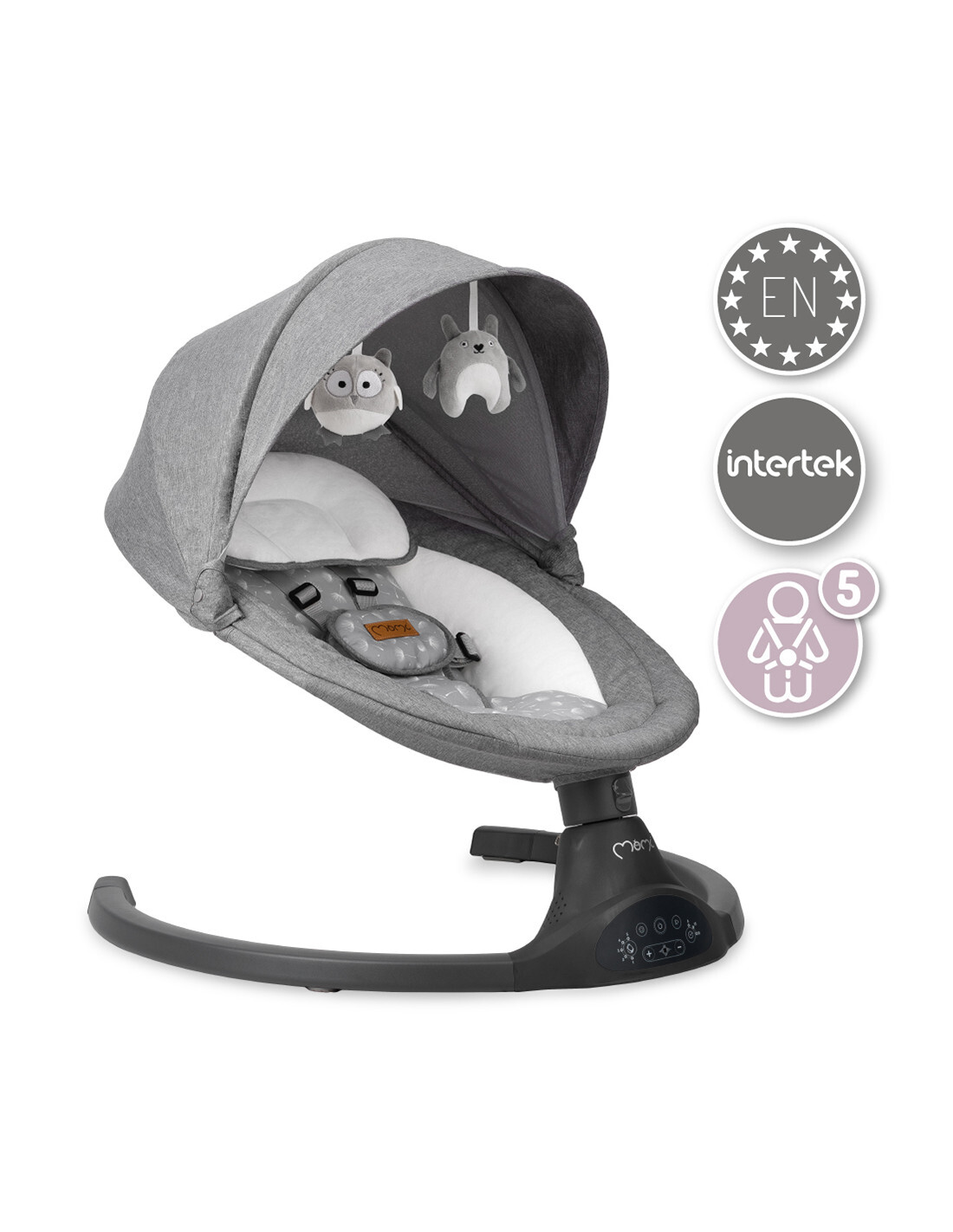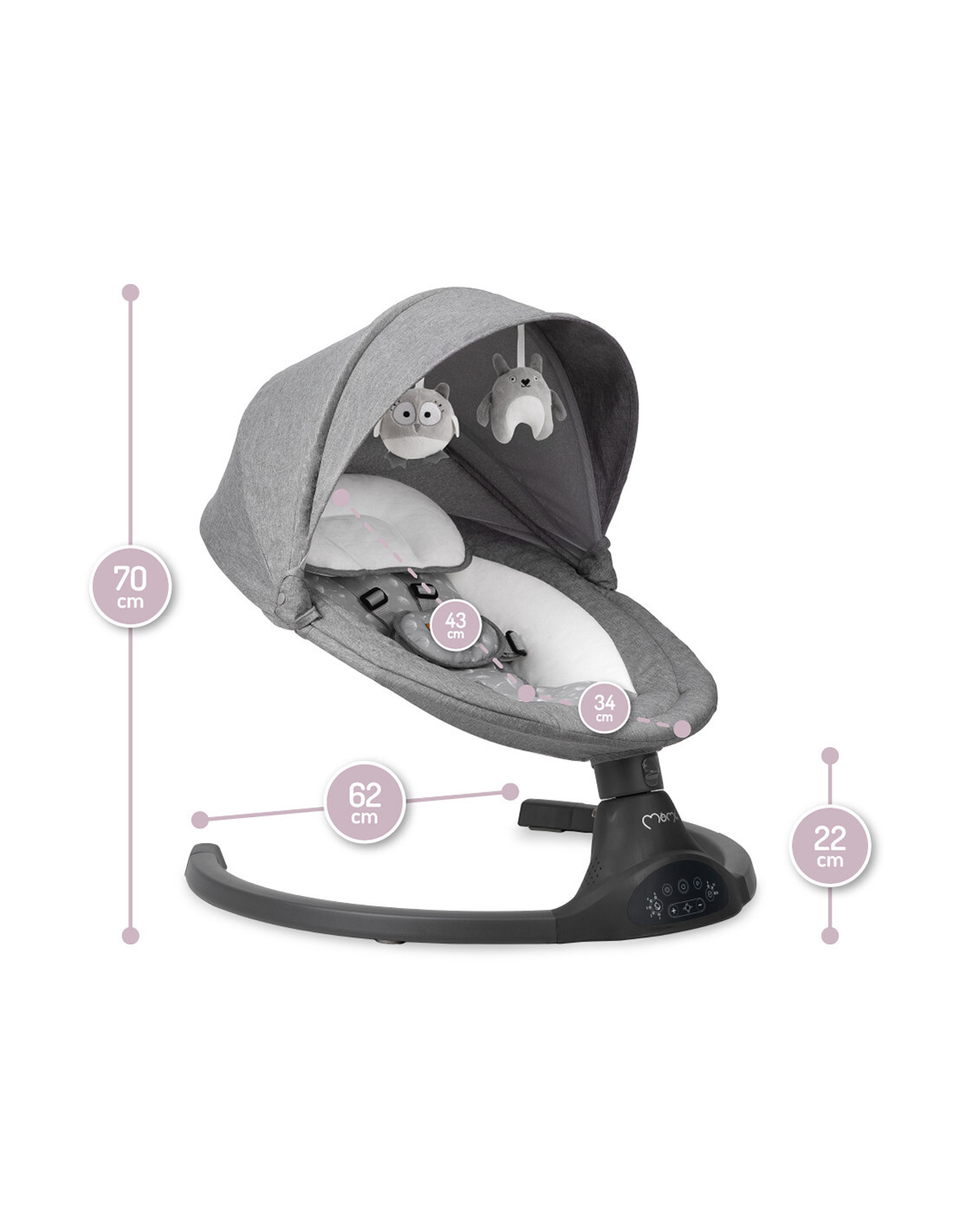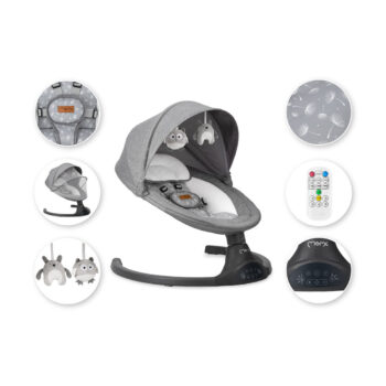Predstavljamo vam MoMi KENANI sivo električno gugalnico z daljinskim upravljalnikom Eleganca in funkcionalnost MoMi KENANI ONYX je elegantna črna različica priljubljene gugalnice KENANI, zasnovana za udobje in varnost vašega dojenčka. Ta električna gugalnica posnema naravne gibe materinega trebuha in pomaga pomiriti in sprostiti vašega otroka. Ključne lastnosti:
