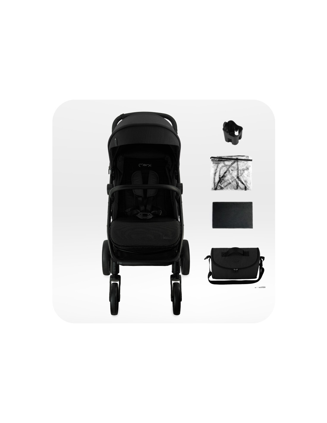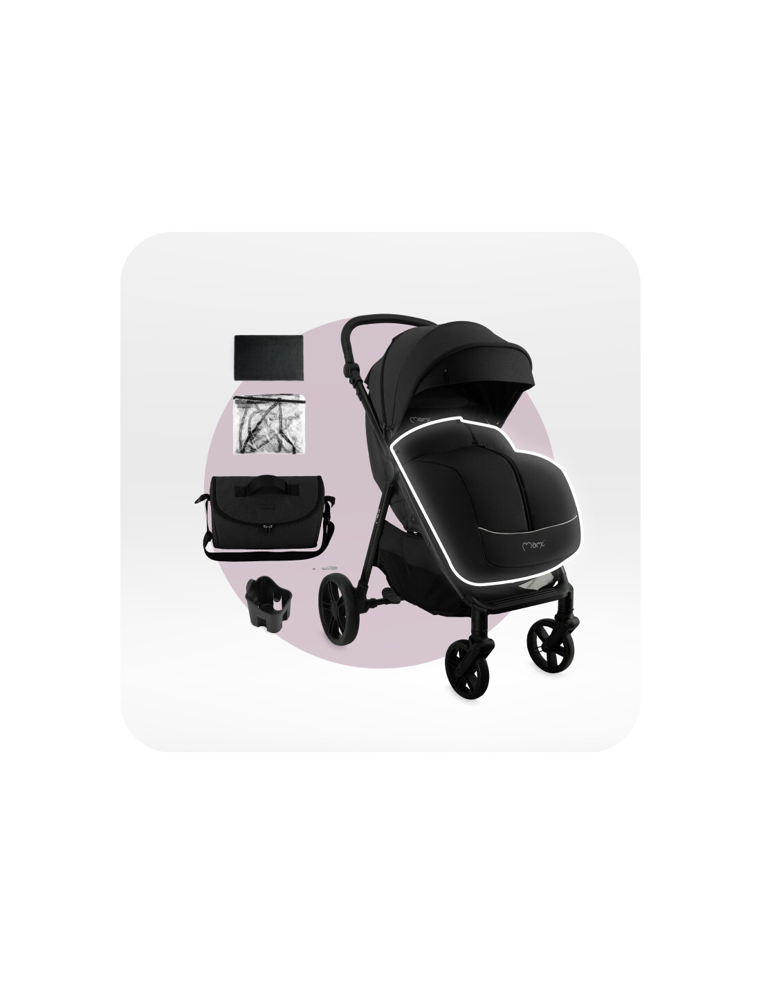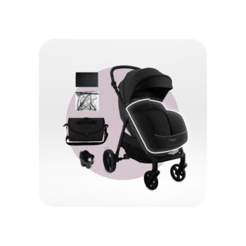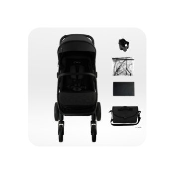 - Obsežna oprema: Voziček je opremljen z dodatno opremo, ki vključuje torbo, prevleko za noge, prevleko za dež, držalo za skodelico, mrežo proti komarjem in zapestni trak.
