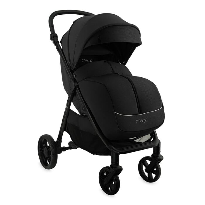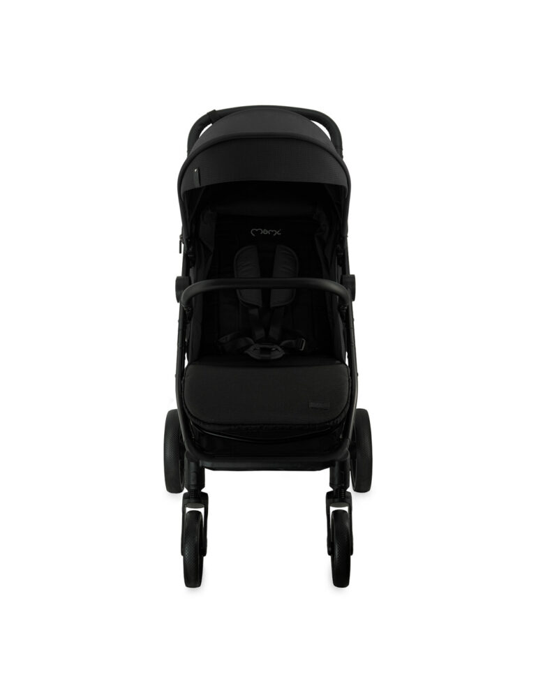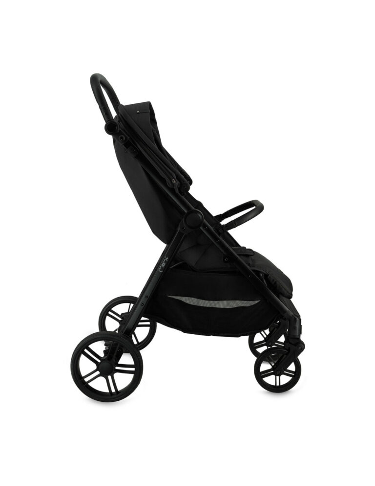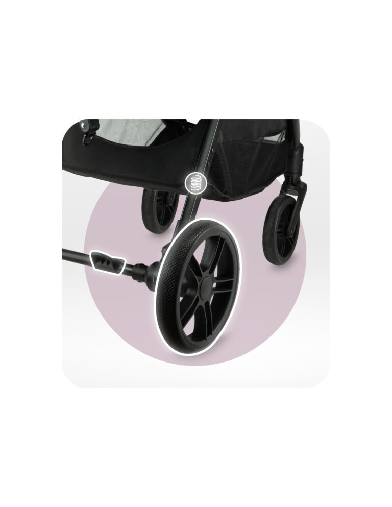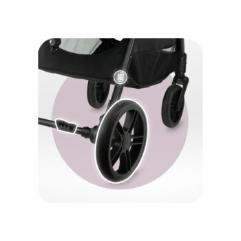 - Popolno vzmetenje: Vzmetenje na vseh štirih kolesih poveča udobje za otroka in olajša krmiljenje vozička.