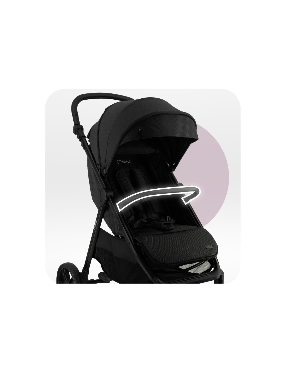 - Prostoren sedež: Širok in udoben sedež zagotavlja dovolj prostora za otroka, kar mu omogoča udobno vožnjo.