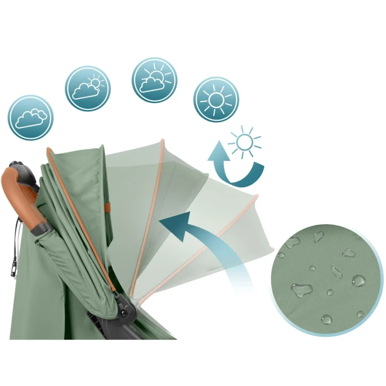 ✔ Ščiti pred dežjem in neposredno izpostavljenostjo UV-žarkom. ✔ Prilagodite stopnjo odpiranja glede na to, ali otrok spi ali opazuje okolico. ✔ Omogoča vam, da otroka pokrijete pred neposredno sončno svetlobo, vetrom ali rahlim dežjem.