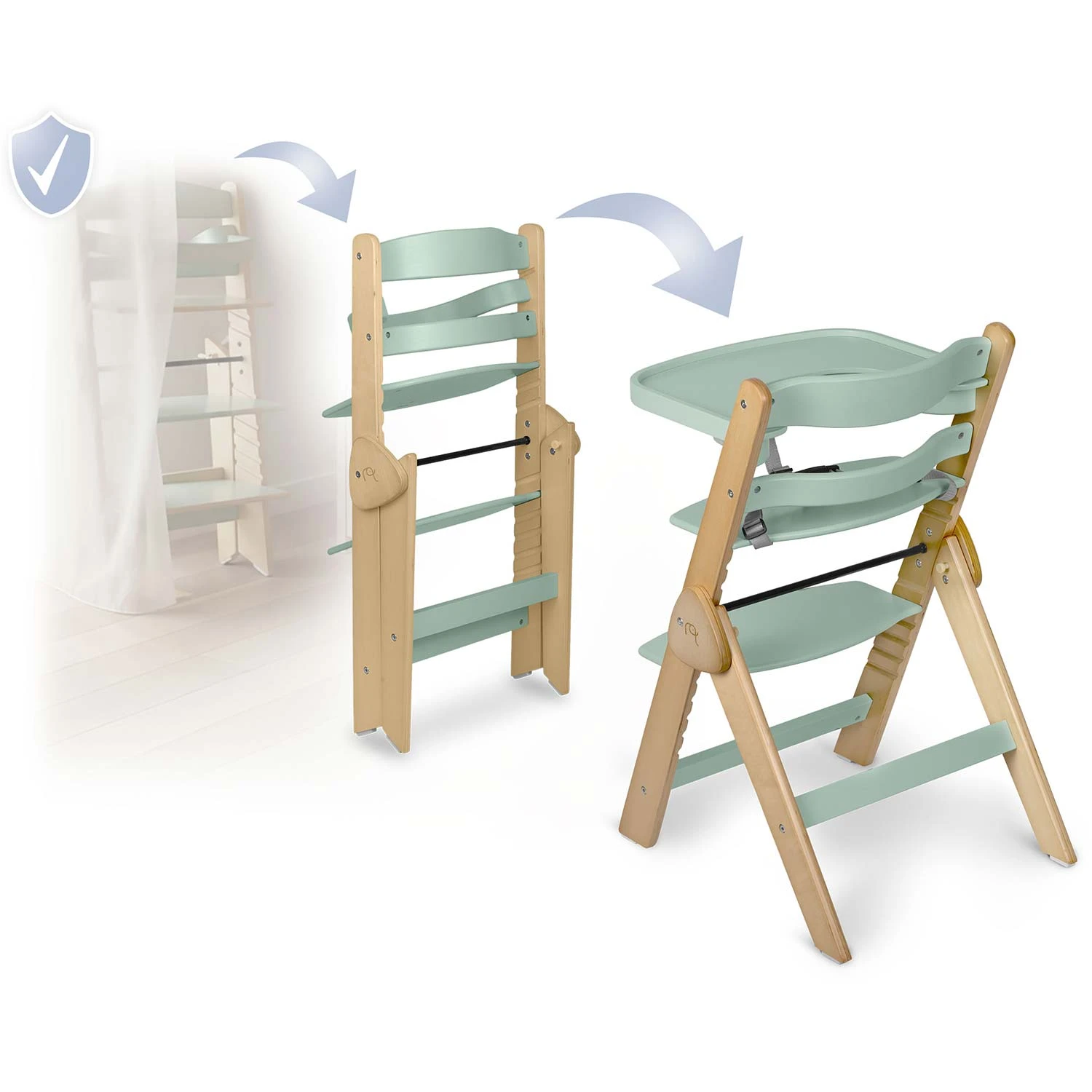 ⬜Za otroke od 6. meseca dalje Spremlja vas od prvih obrokov in raste z vašim otrokom – od dojenčka do malčka! ⬜Trdna lesena zložljiva konstrukcija Zagotovljena vzdržljivost in prihranek prostora. ⬜Regulacija Popolna nastavitev višine sedeža in naslona za noge. ⬜Snemljiv predal Praktičen in enostaven za čiščenje. ⬜Mehke blazine Vključene za maksimalno udobje. Lahko se pere ročno. ⬜3-točkovni varnostni pasovi Popolna varnost za vašega malčka. ⬜Ustreza preverjenim evropskim standardom EN14988.