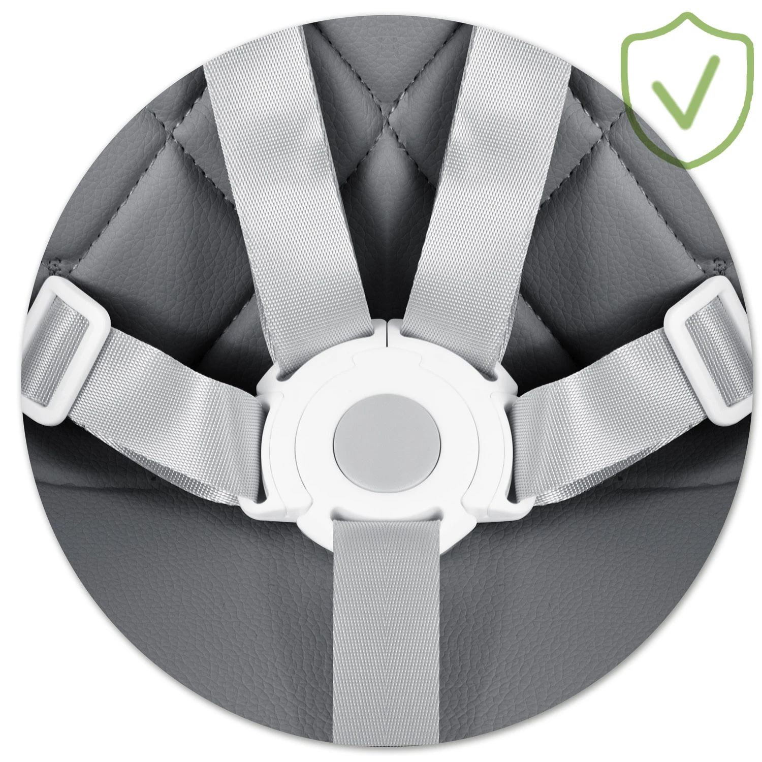 Zanesljivi in preizkušeni pettočkovni varnostni pasovi zagotavljajo, da vaš otrok ne bo mogel sam zapustiti stola in tvegati padca.