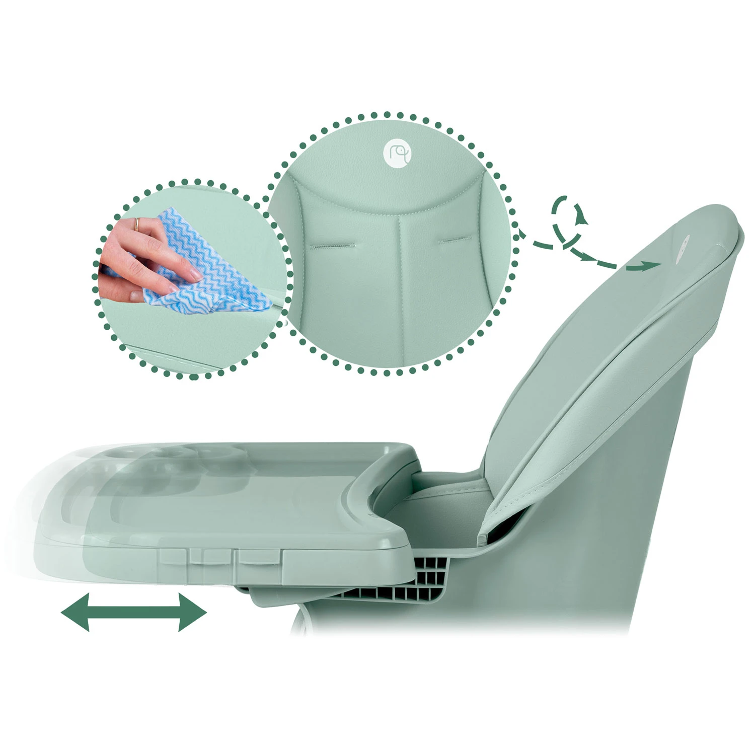 Stolček za hranjenje vam omogoča prosto nastavitev oddaljenosti pladnja od otroka. Kadar koli ga je mogoče tudi popolnoma razstaviti.