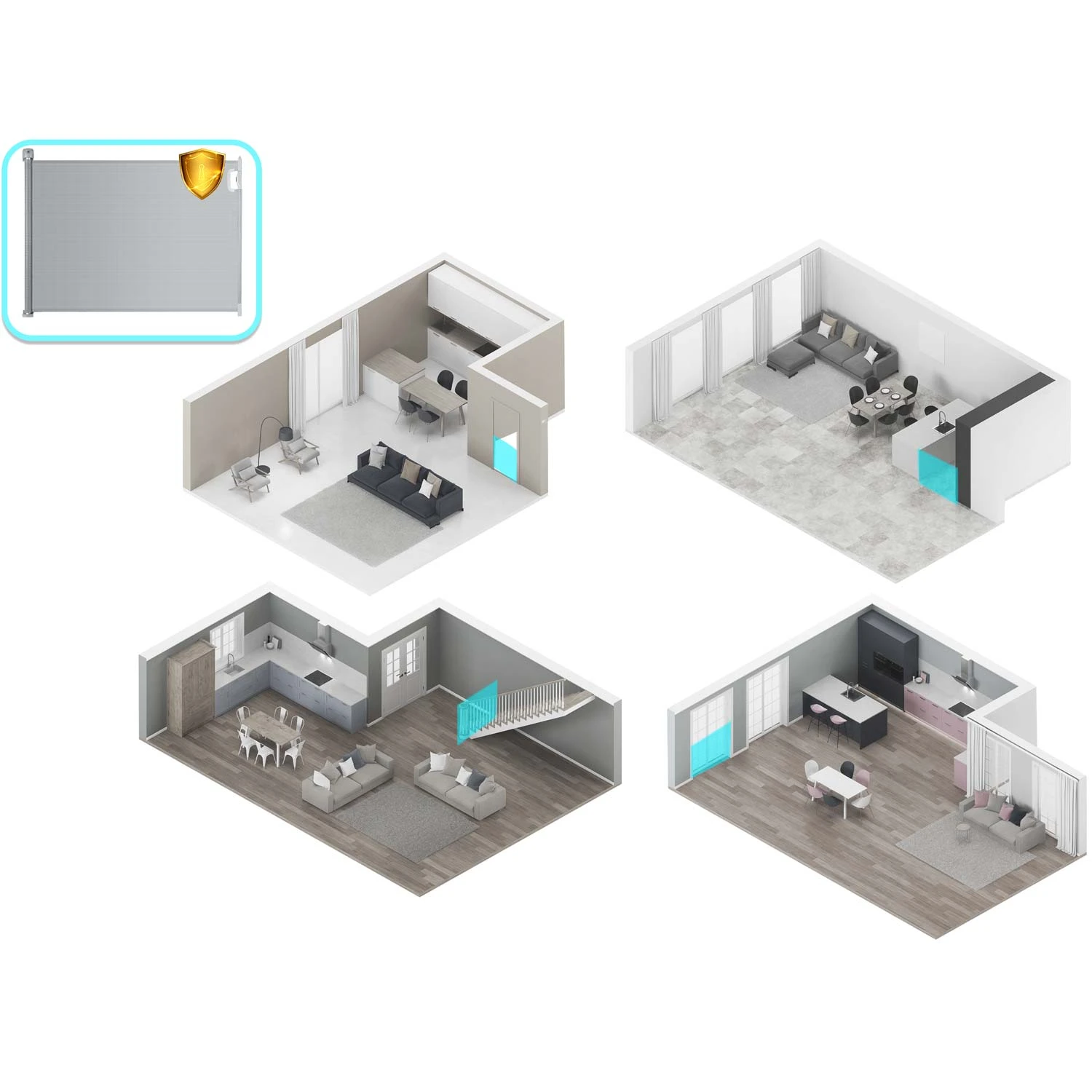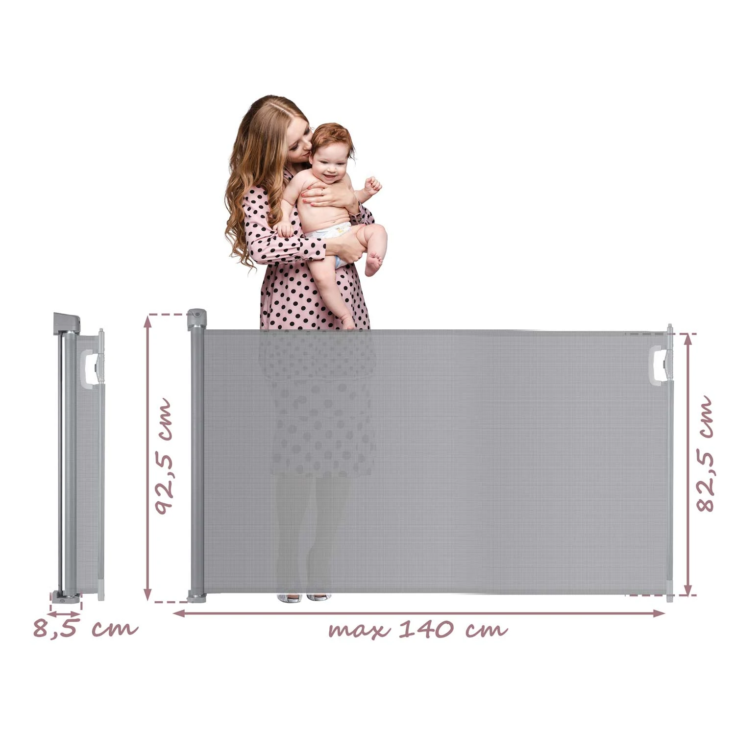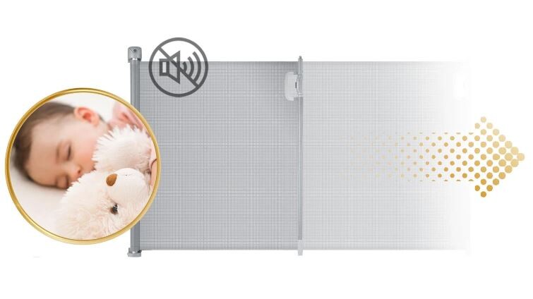 Funkcionalna in estetska, brez pragov/okvirjev, enostavna za čiščenje in vzdrževanje, zavzame zelo malo prostora, nastavljiva do 140 cm, hitro in enostavno zložljiva, material, ki ne vpija umazanije, ne moti estetike notranjosti, popolnoma tiha, izdelana iz močnih certificiranih PU vlaken, ima certifikate, ki potrjujejo njeno varnost.
