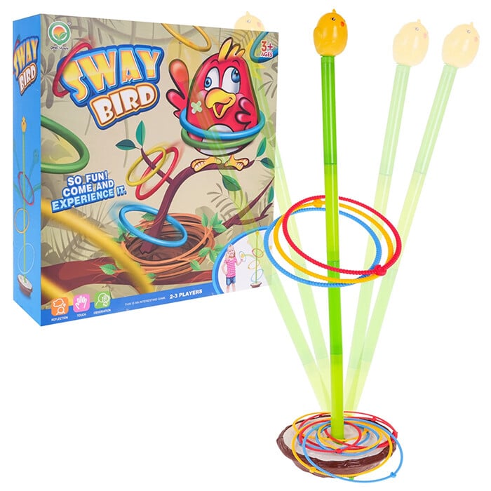 Spretnostna igra z imenom Sway bird za otroke, stare 3 leta in več. Igrata lahko dva ali trije igralci. Majhen ptiček, piščanec, se ziblje na gnezdu, naloga pa je postaviti vse obroče na steblo. V nasprotju z videzom ni tako enostavno, kot se morda zdi. Igrača ima tri stopnje nastavitve višine; višje kot je steblo, višja je stopnja težavnosti. Največja višina stebla je 90 cm. Zmanjšati jo je mogoče z odstranitvijo dela. Vsak del stebla je dolg približno 19,5 cm. Obroči so na voljo v treh različnih velikostih; manjši kot je krog, težje ga je zadeti. Igra razvija reflekse, koncentracijo in natančnost ter podpira razvoj koordinacije rok in oči. Igro napajata 2 bateriji C (R14) 1,5 V, ki nista priloženi. Pravila igre: – steblo s piščancem prepognite in ga položite na tla, – vsak igralec mora stati enako oddaljeno od igrače, – vsak igralec dobi obroče v barvi po svoji izbiri, – izmenično mečemo obroče na steblo, – prvi, ki postavi vse svoje obroče na steblo, zmaga.