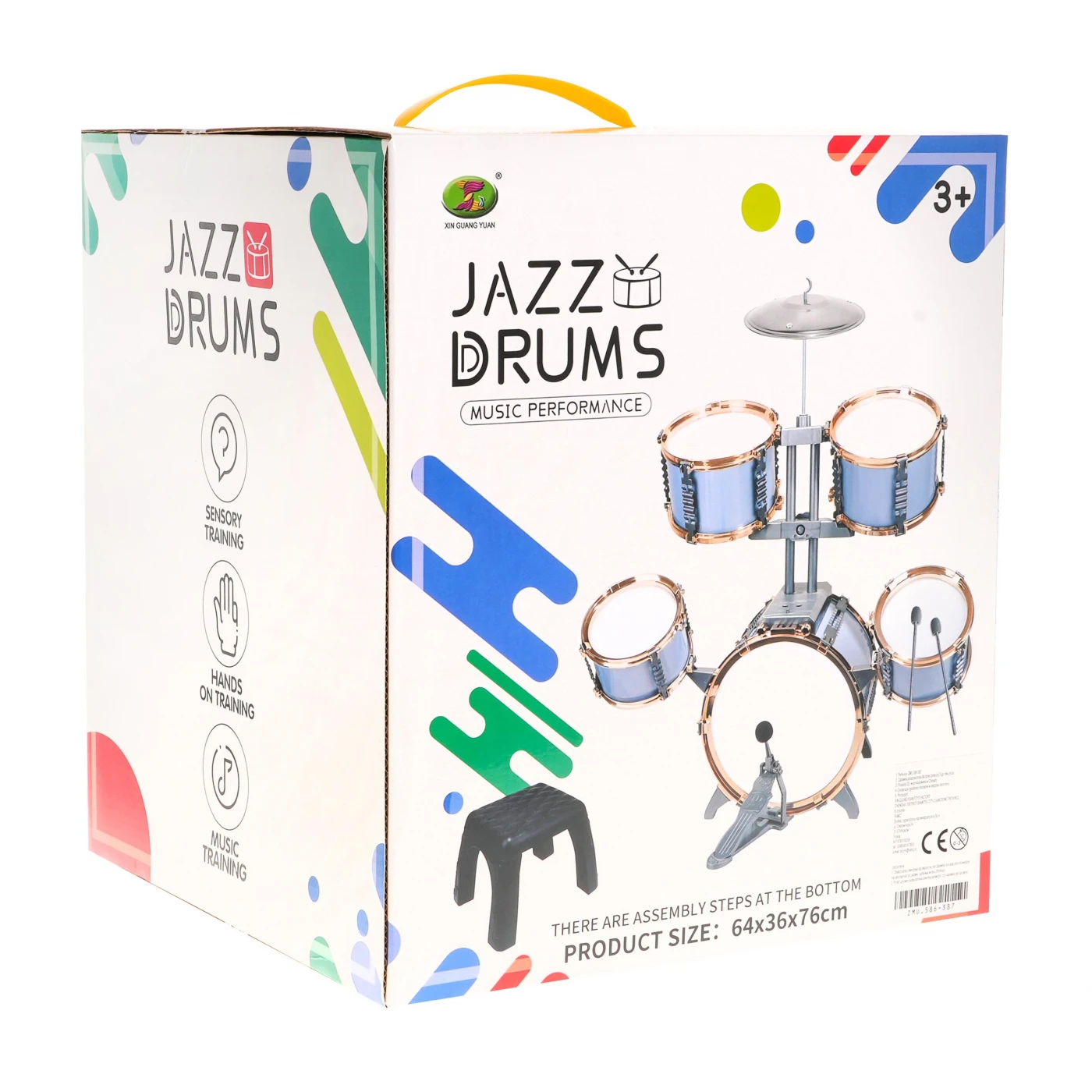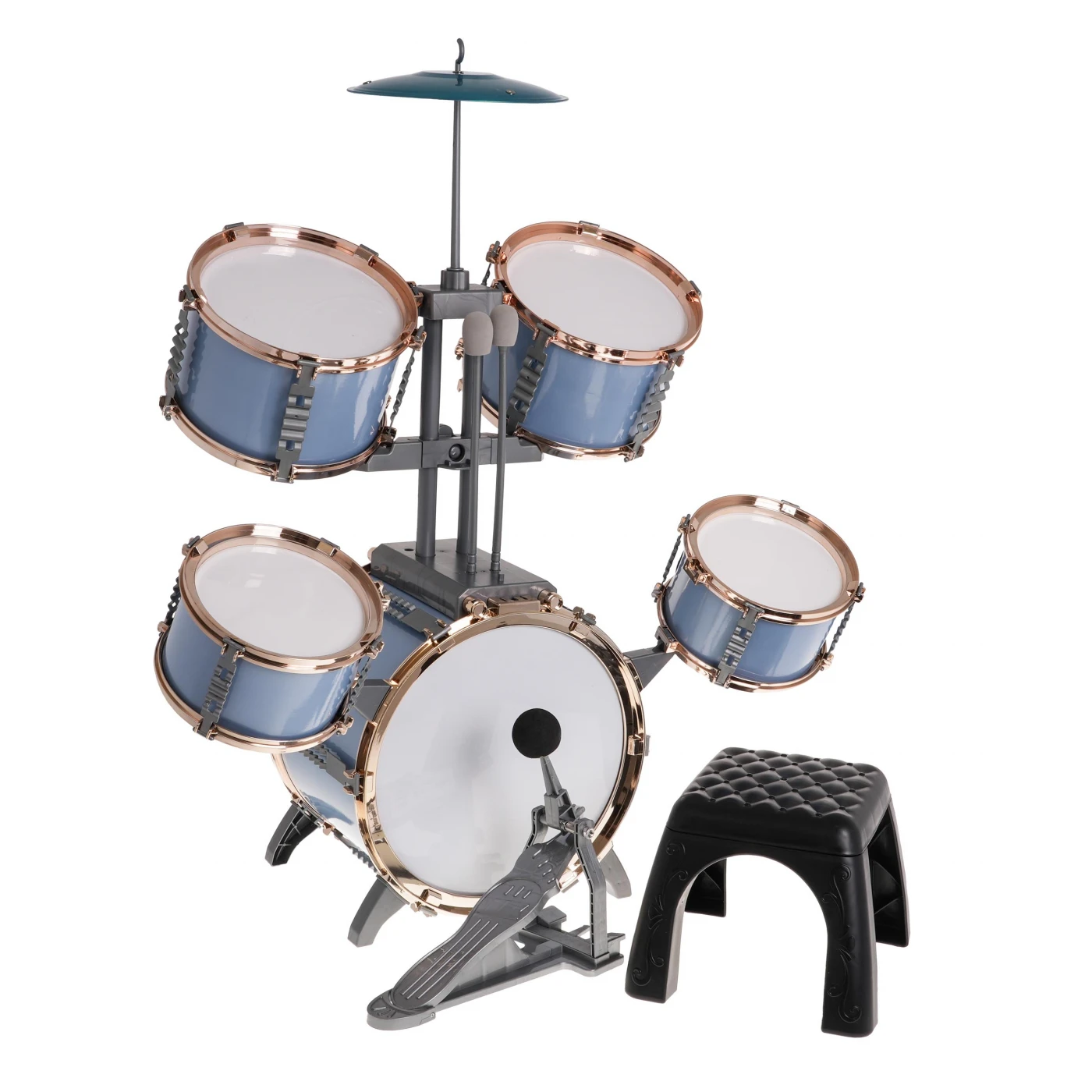 Ta velik, moder komplet bobnov s stolčkom je igrača za otroke, stare 3 leta in več. Komplet vsebuje 5 bobnov, kovinsko činelo, 2 kladiva in stolček.