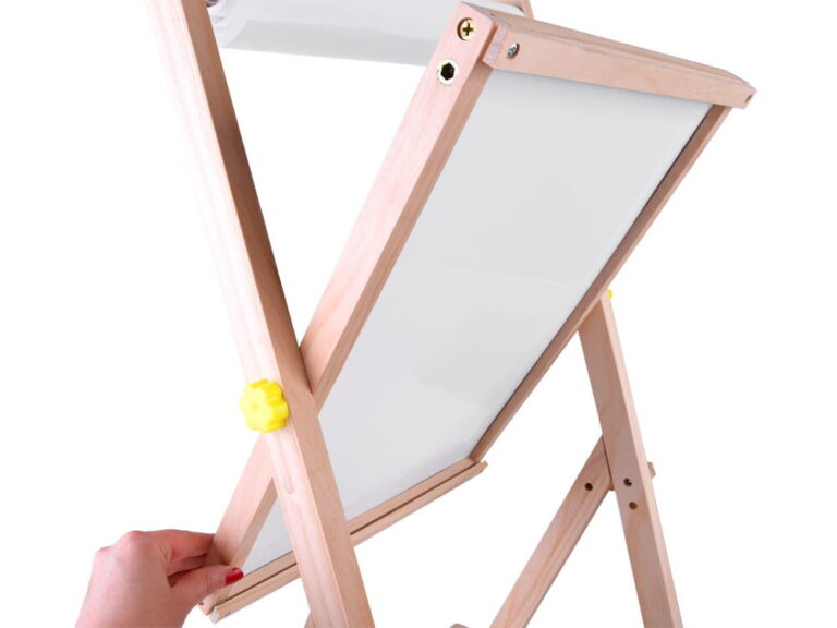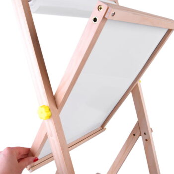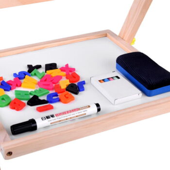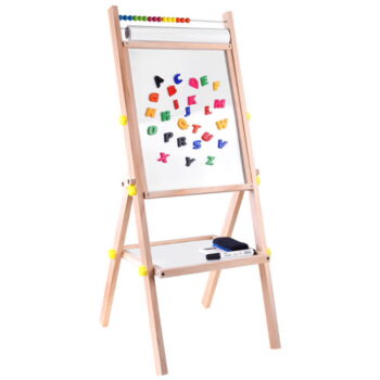 Dvostranska lesena tabla z dvema različnima površinama za slikanje in risanje bo zadovoljila potrebe vsakega otroka. Tabla, opremljena s polico za potrebne pripomočke, abakusom, papirnatim zvitkom in magnetnimi črkami, bo vsakemu otroku zagotovila veliko ustvarjalne in umetniške zabave.