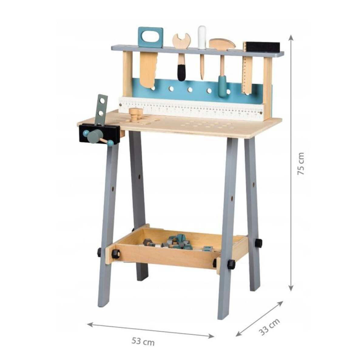 - Kakovostna izdelava: Delovna miza je izdelana iz visokokakovostnega lesa, kar zagotavlja vzdržljivost in varnost med igro.