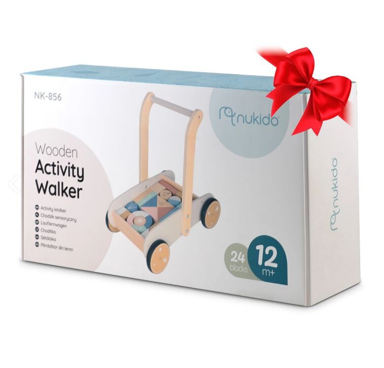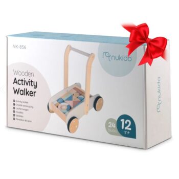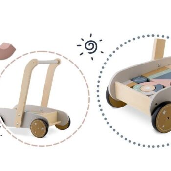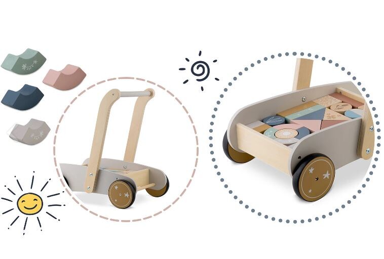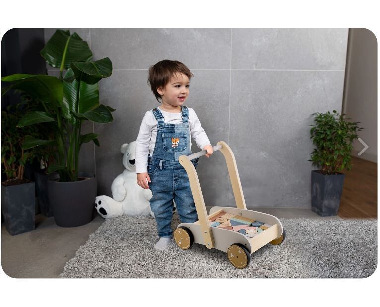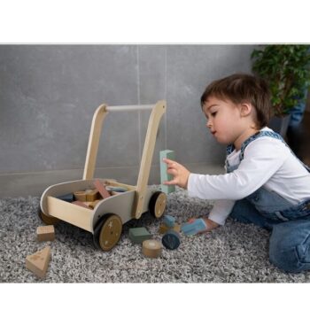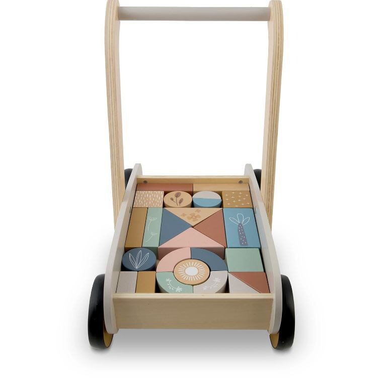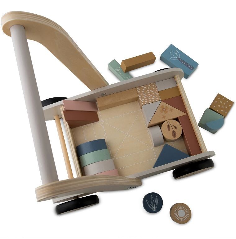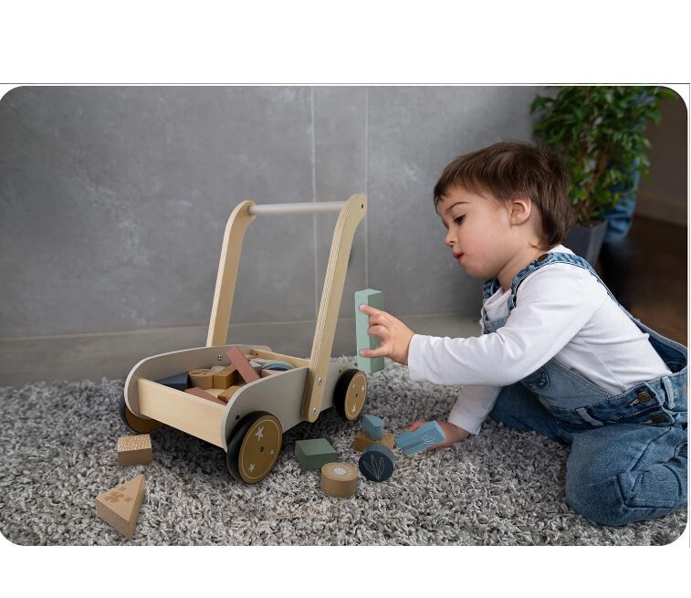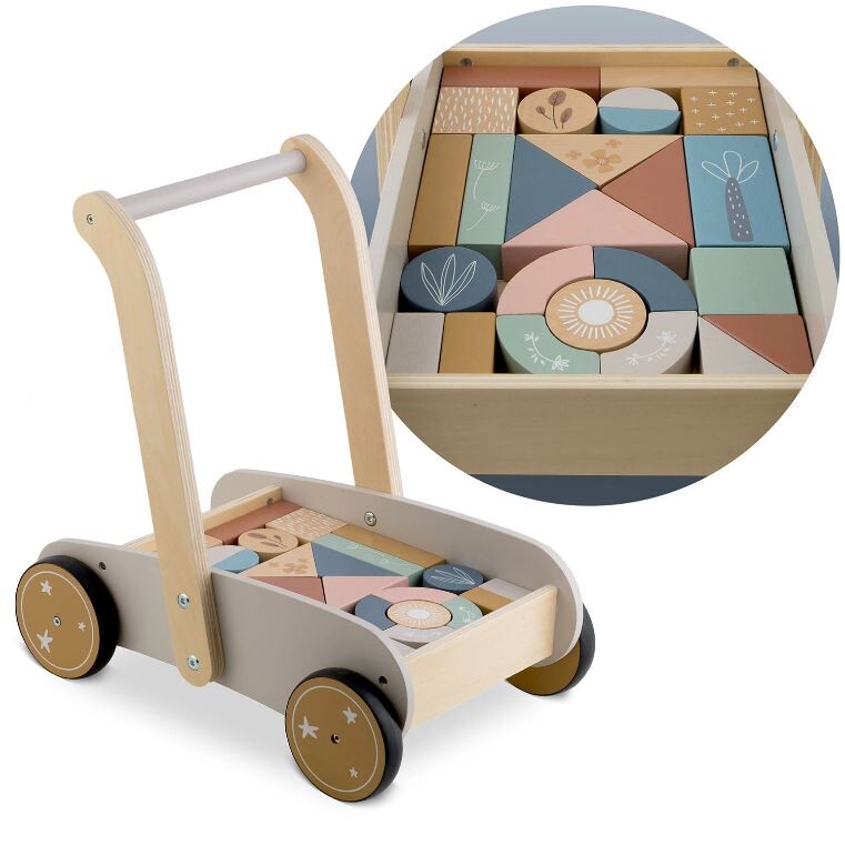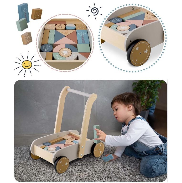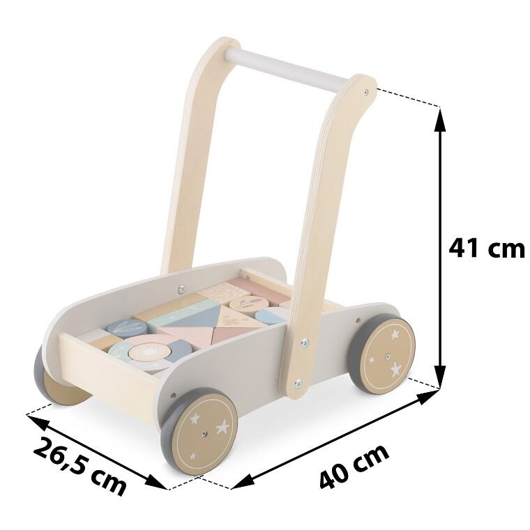 25 Naj vaš otrok naredi prve korake s tem neustavljivim lesenim vozičkom. Voziček vsebuje 24 lesenih kock. Kocke so odlične za zgodnjo vzgojo otrok skozi igro. Voziček ima gumijasta kolesa, ki ne poškodujejo parketa. Starost: za otroke od 1 leta naprej Dimenzije: 40 x 26,5 x 41 cm Igrača je izdelana iz lesa in pobarvana z naravnimi barvami