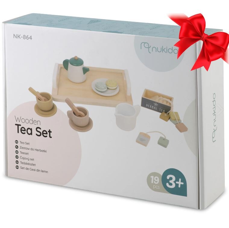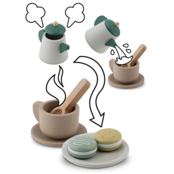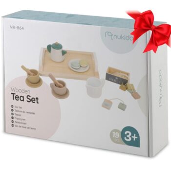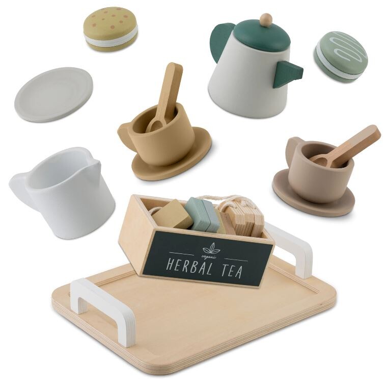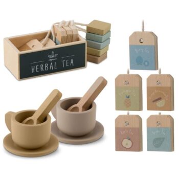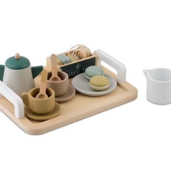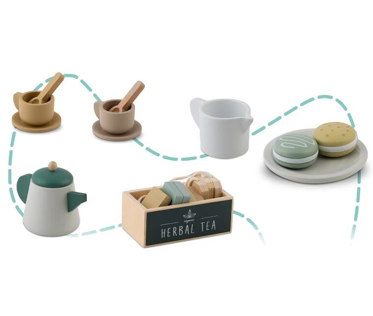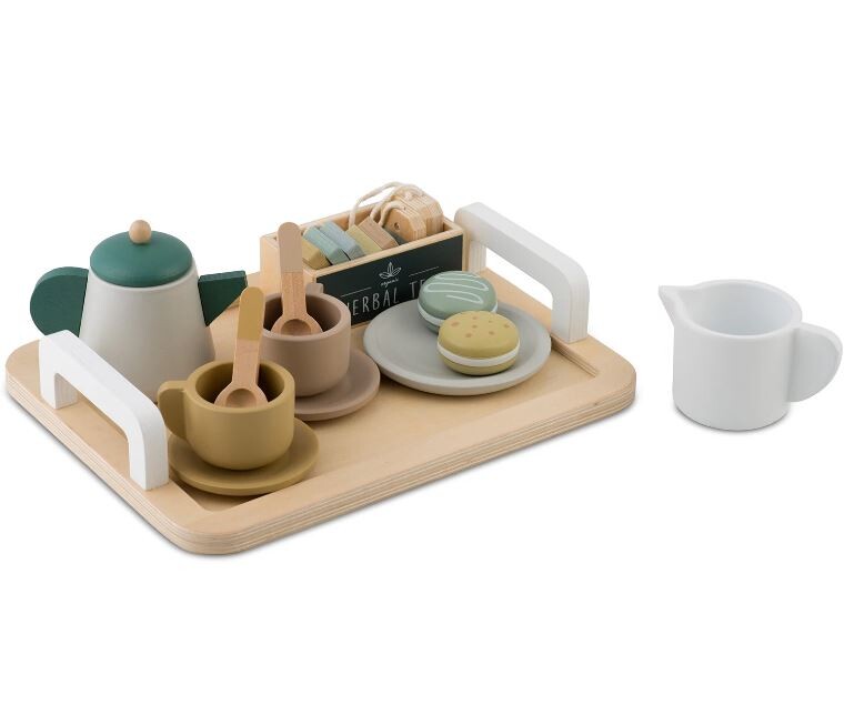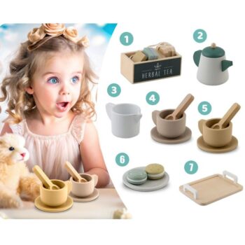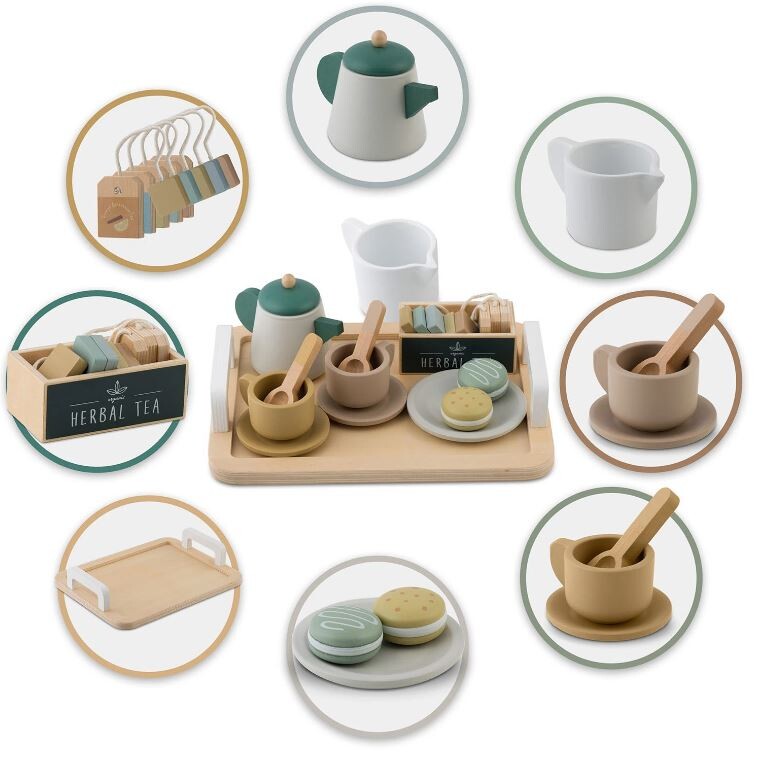 Izobraževanje in zabava! Komplet vsebuje visokokakovostne lesene elemente, kot so vrč, skodelice, žlice in servirni pladenj. Na njem lahko postrežete tudi makrone in v skodelice položite priložene čajne vrečke, kar daje celotnemu prizoru pristnost in vašemu otroku omogoča organizacijo elegantnih zabav.