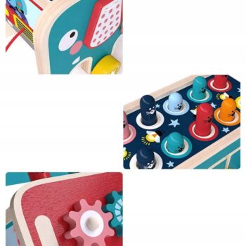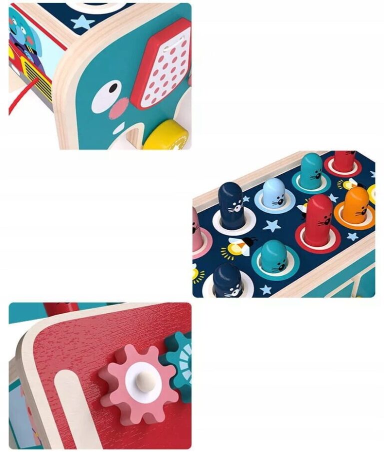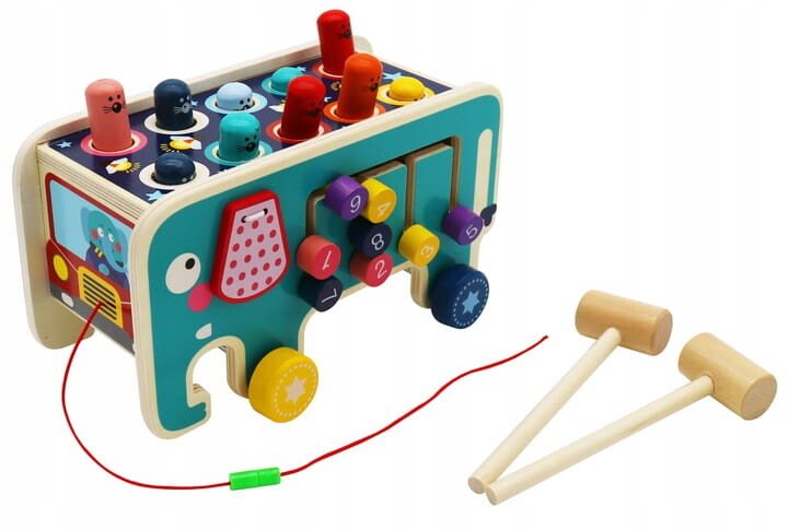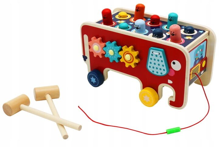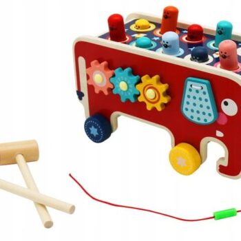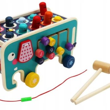 Leseni Montessori slon Izdelano iz lesa – lesene igrače so brezčasna ponudba, ki bo navdušila vsakega malčka. Klasična lepota lesa in njegova vzdržljivost sta ga vedno zelo cenili. Ta surovina izgleda dobro tako v naravnih kot barvanih barvah. Izdelek je varen za vsakega otroka. Naravne surovine pomenijo, da tudi če otrok vzame igračo v usta, ne bo imel stika s plastiko. Skrbno izdelana igrača bo vašemu otroku zagotovila veliko ur zabave in učenja . Igrača, izdelana v skladu z Montessori pravili. Uči med igro, podpira celosten razvoj otroka, pisane oblike ne bodo vplivale le na prepoznavanje in utrjevanje barv, temveč med drugim razvijajo tudi domišljijo in motorične sposobnosti. Montessori metoda poučevanja postaja vse bolj priljubljena, metoda, ki vpliva na razvoj otroka na vseh ravneh. Način izdelave predmetov in njihov namen otroka pripravita na nekaj novega na vsakem koraku. Zagotavlja izkušnje, iz katerih otrok gradi svoje znanje in samozavest. Prepoznavanje oblik in barv je veščina, ki jo bo moral vaš malček obvladati že v predšolskem obdobju. Lesena sestavljanka Slon govori o tolčenju miši z lesenimi kladivi. Ko udarimo eno miš – na nasprotni strani samodejno izskoči miška, kar otroku daje dodatna čustva. Poleg praznjenja energije se otrok uči tudi koncentracije in razvija koordinacijo med rokami in očmi. Rdeča stran slona Na rdeči strani slona so trije barvni zobniki. Ko premaknemo eno od koles, se bosta zavrteli tudi drugi dve kolesi. To pozitivno vpliva na učenje osnov mehanike. Modra stran slona Ta stran ima labirint s številkami. Med igro malček vadi koncentracijo in logično razmišljanje. Sprednji del igrače Slon ima vrteča se kolesa, medtem ko ima sprednji del igrače vrvico, s katero lahko otrok vleče slona. Dimenzije izdelka: Dimenzije: 23 x 12 x 10,5 cm Izdelana iz lesa, pobarvana z varnimi barvami.