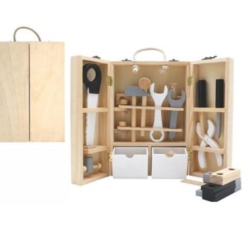 Komplet za domače mojstre bo vsakemu malčku prinesel veliko zabave. Vašega malčka bo naučil uporabljati orodje in izvajati osnovna popravila, pri čemer bo posnemal domačega mojstra. Igranje s predstavljenim kompletom bo pozitivno vplivalo na otrokov razvoj – njegovo inteligenco, logično razmišljanje, ustvarjalnost in ročne spretnosti. Mali domači mojster lahko iz teh elementov ustvari preproste konstrukcije in preživi čas skupaj z očetom. 3 Vključeno: – škatla – dva praktična predala – žaga – 6 izvijačev – 2 izvijača – 2 kladiva – ključi – klešče – vijaki in matice 2 Dimenzije zaprtega kovčka: 21 cm x 31 cm x 8 cm Dimenzije odprtega kovčka: 42 cm x 31 cm x 5 cm Dolžine orodja: 16 cm Velikost embalaže: 23 cm x 33 cm x 10 cm Po priporočilih proizvajalca je namenjen otrokom, starejšim od 3 let . Ima certifikat CE, pakiran je v originalni škatli z navodili za samostojno sestavljanje.