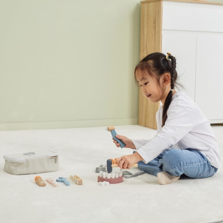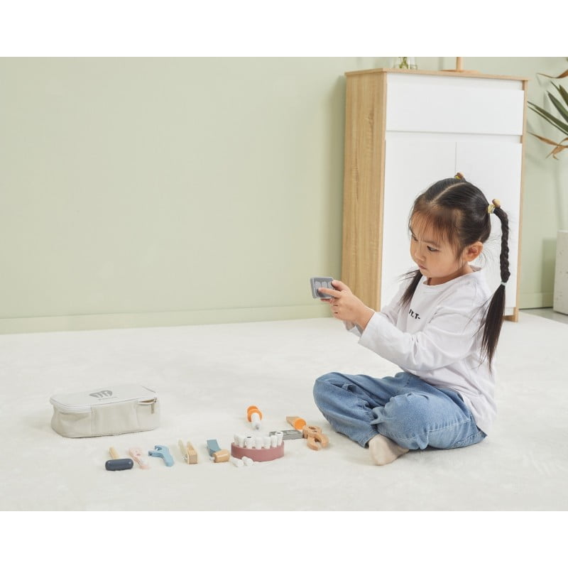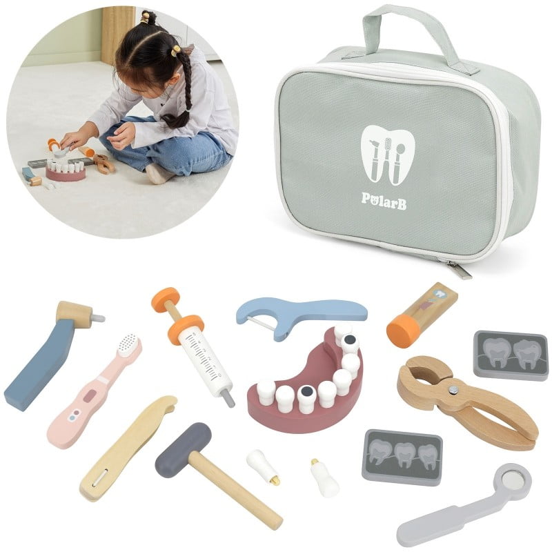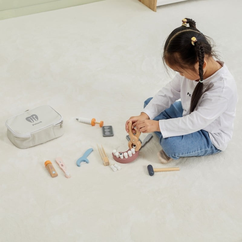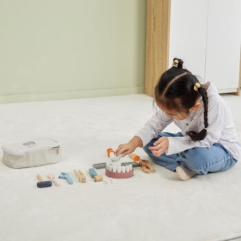 Značilnosti: – starost 3+ let – komplet vsebuje prenosno torbo z grizali in 11 elementi zobozdravstvene opreme – zobe je mogoče odstraniti in namestiti – igra bo zmanjšala strah pred obiskom zobozdravnika – igrače so izdelane iz lakiranega lesa, pobarvanega z nestrupenimi barvami Igrača razvija: – samozavest – domišljijo in ustvarjalnost – logično mišljenje – ročne spretnosti – motorične spretnosti Dimenzije izdelka: