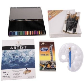 - DODATKI V KOMPLETU – slikarski komplet sestavljajo izjemno pomembna orodja za vsakega umetnika, ki želi ustvarjati. Takšen komplet vam bo omogočil, da osvobodite svojo domišljijo in se odmaknete od sive realnosti. Komplet vsebuje dodatke, kot so: 14 čopičev, 12 akrilnih barv, 36 barvic, sponke za papir, blazinica, paleta za mešanje barv, 3 slikarska platna in stojalo.