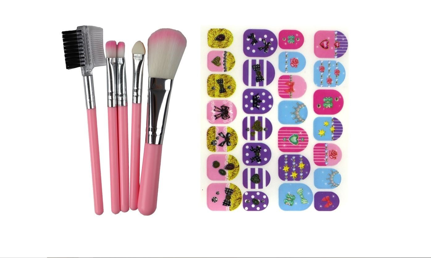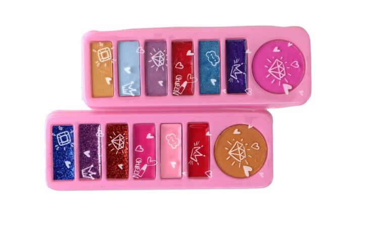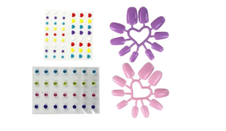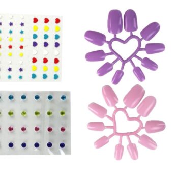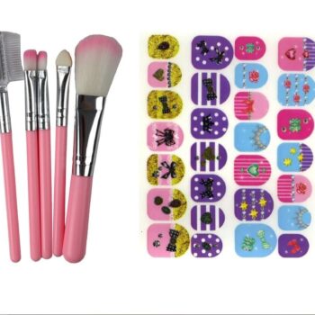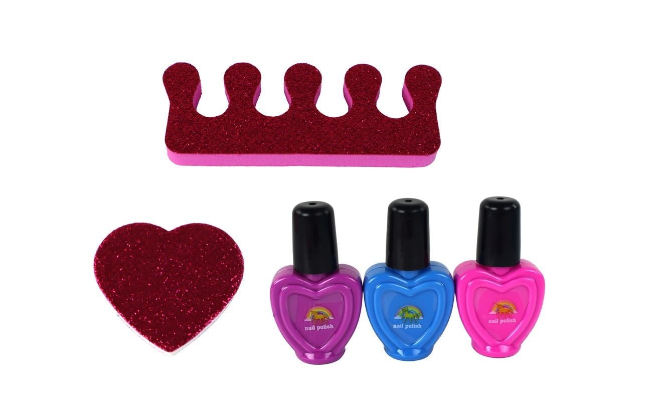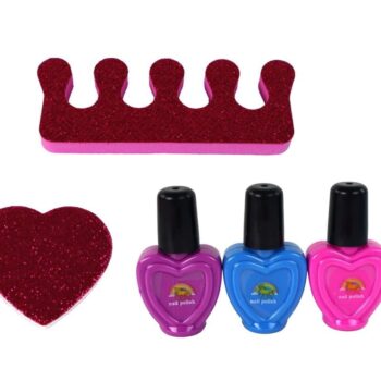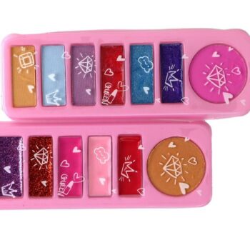 Elementi kompleta: – hišica – prozorne posodice – rdečilo za lica – 6 senčil za oči – 3 glos za ustnice – bleščice – 5 čopičev za ličenje – bleščeči kozmetični ločevalnik – 3 laki za nohte – 2 šabloni za nohte – nalepke za nohte